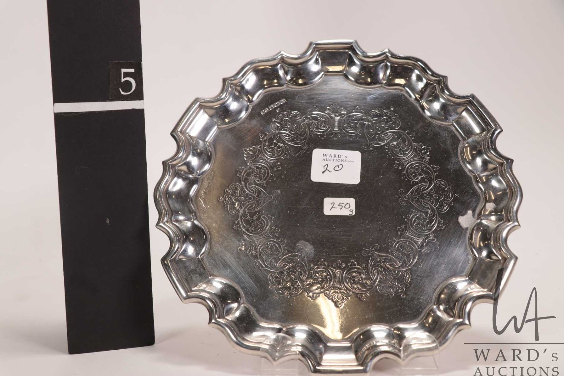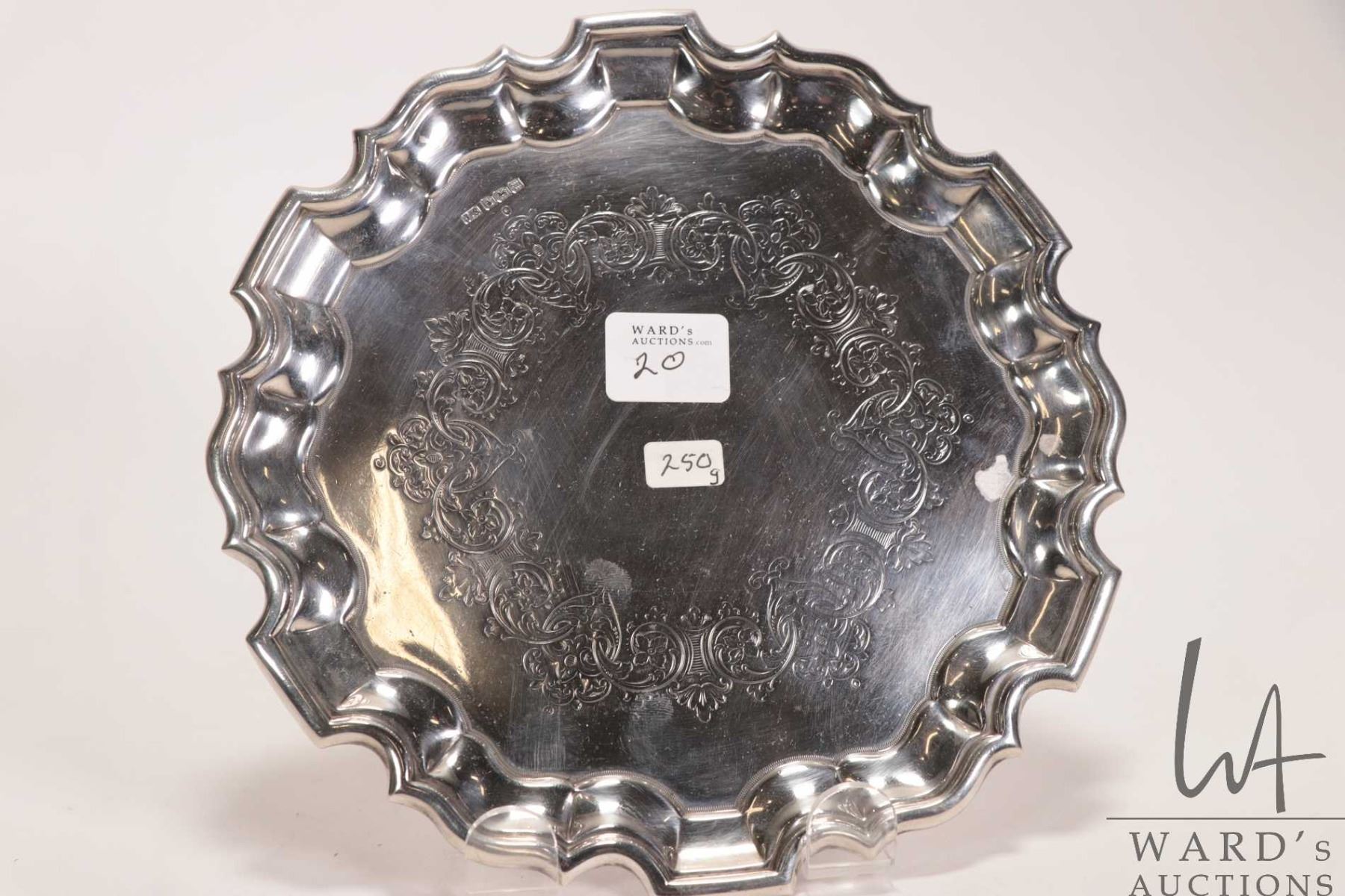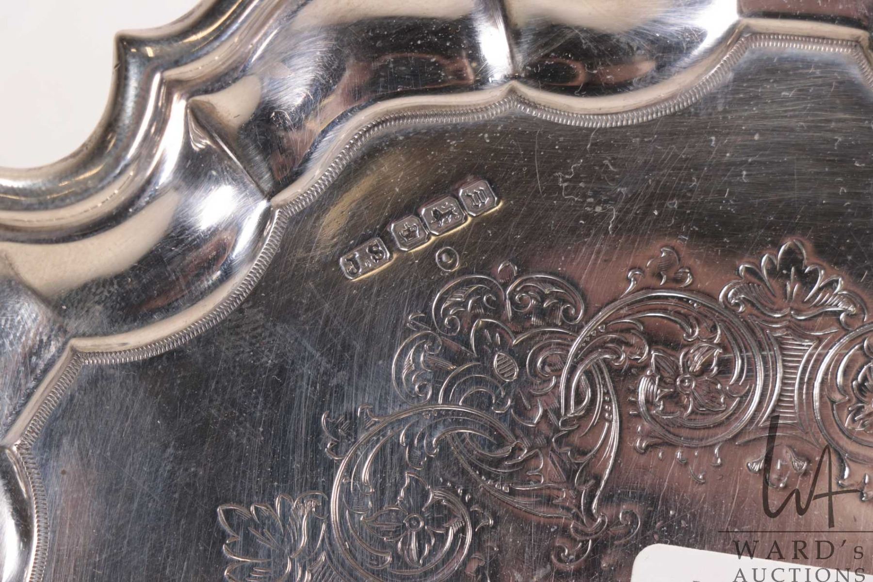 Sheffield 1904 sterling silver tray with sculpted edge and engraved interior. 7-1/4" in diameter