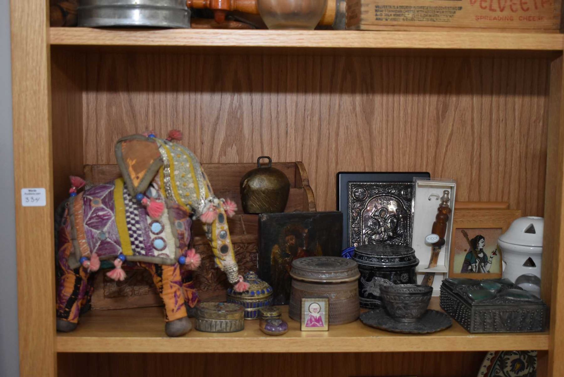 Shelf lot of East Asian collectibles including lidded wooden boxes, carved wooden letter organizer, letter opener, candlesticks etc. Not Available For Shipping. Local Bidders Only