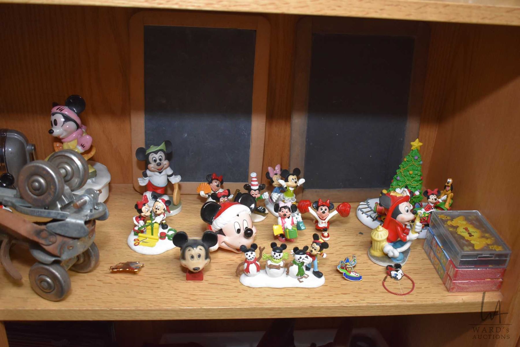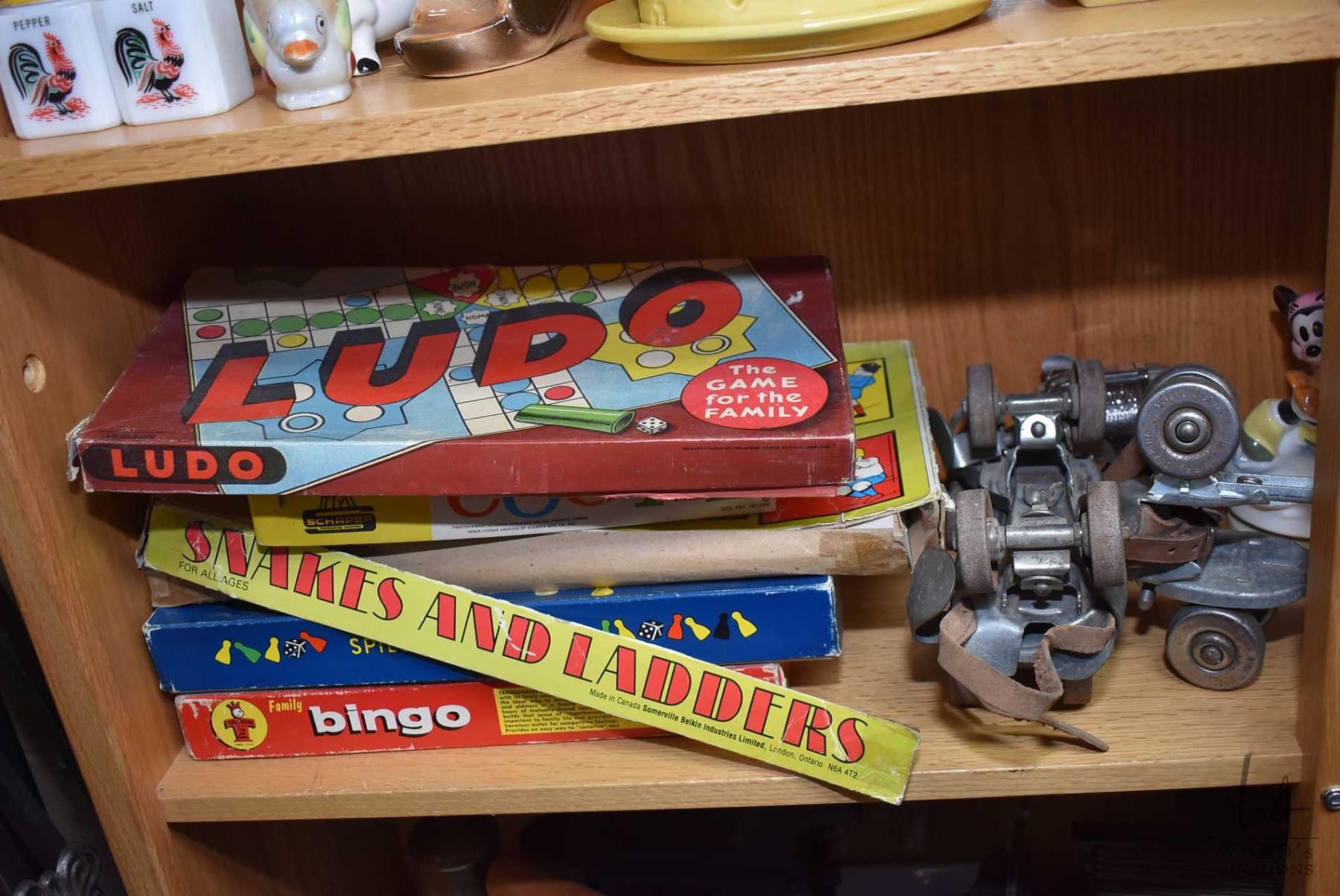 Shelf lot of children's collectibles including Mickey and Minnie collection, music boxes, playing cards, tree ornaments etc. plus two chalk boards, two pairs of roller skates, vintage board games etc.