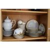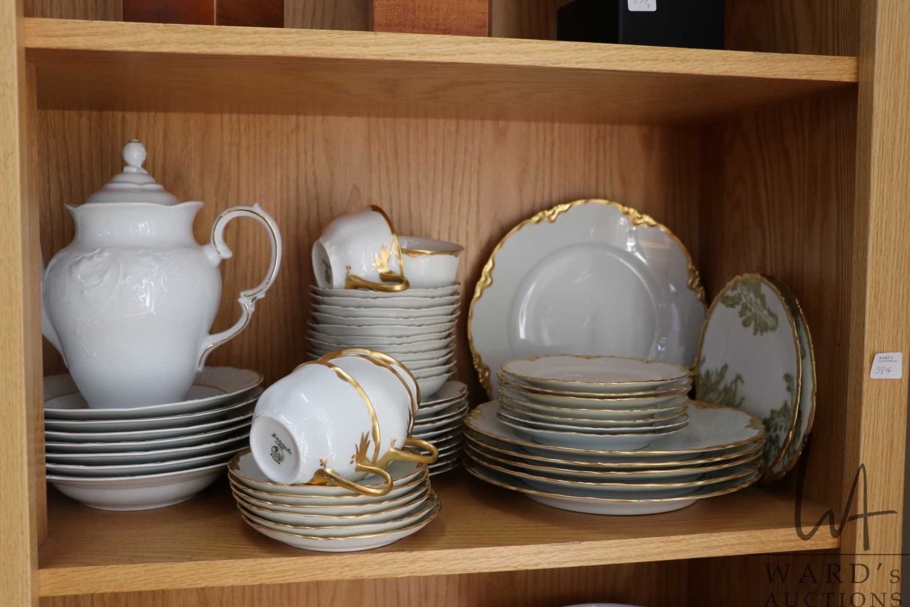 Shelf lot of china collectibles including Haviland France gold and white, Theodore Haviland Limoges "Chambord" and Bavarian gold and white teapot etc. plus Bavarian gold lidded sugar bowl and cream jug. Note: No shipping for this lot. Local pickup only