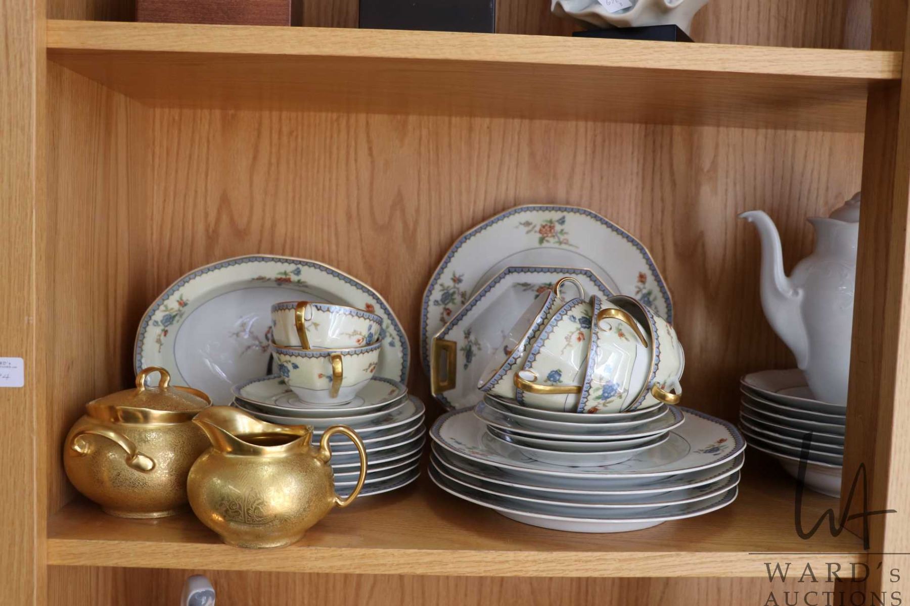 Shelf lot of china collectibles including Haviland France gold and white, Theodore Haviland Limoges