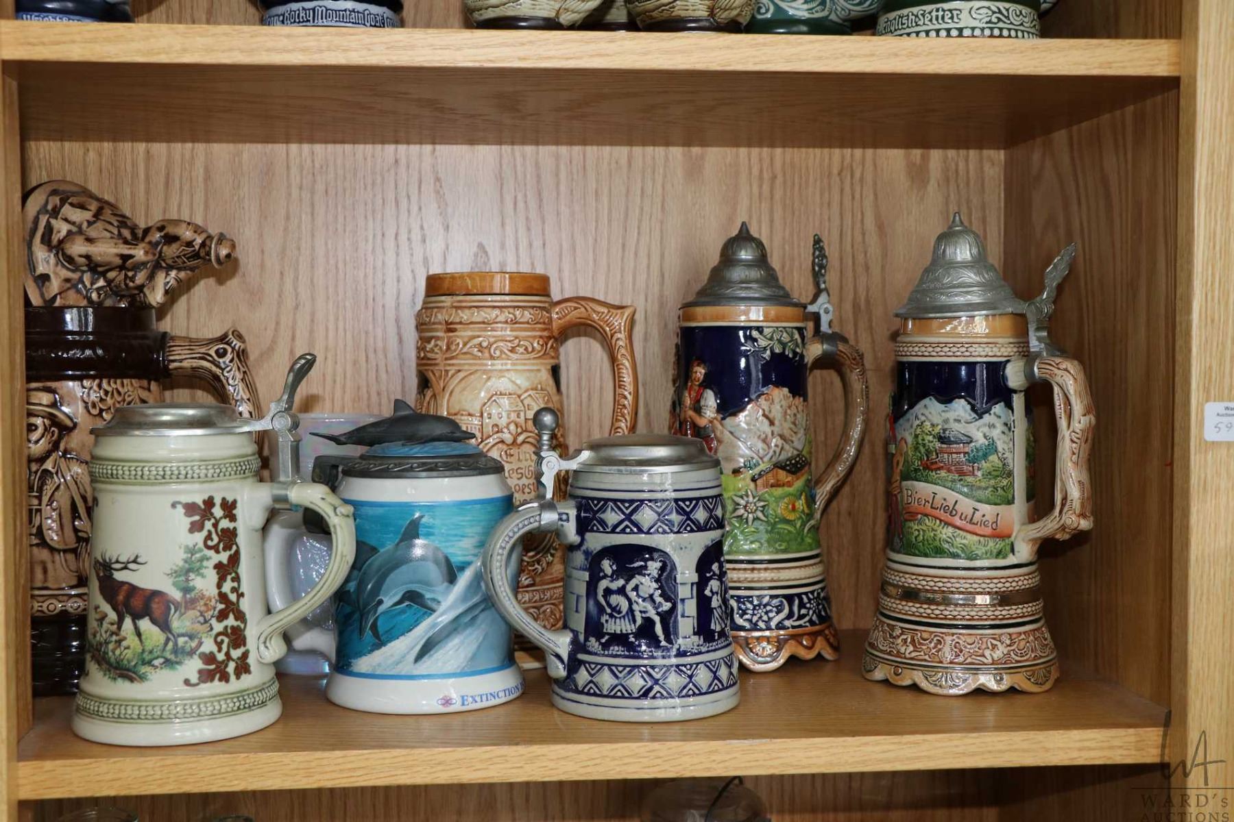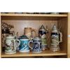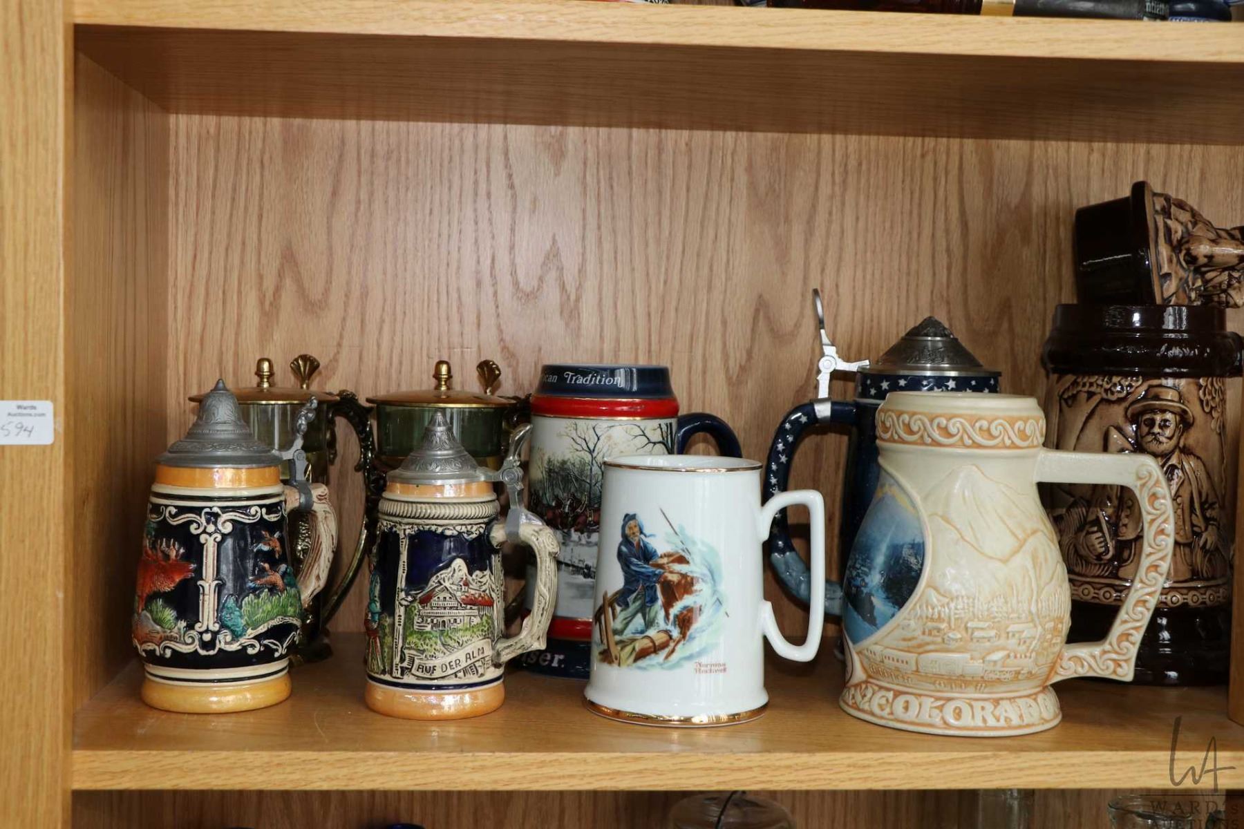Shelf lot of collectible beer steins, some with pewter lids etc. Note: Not available for shipping. L