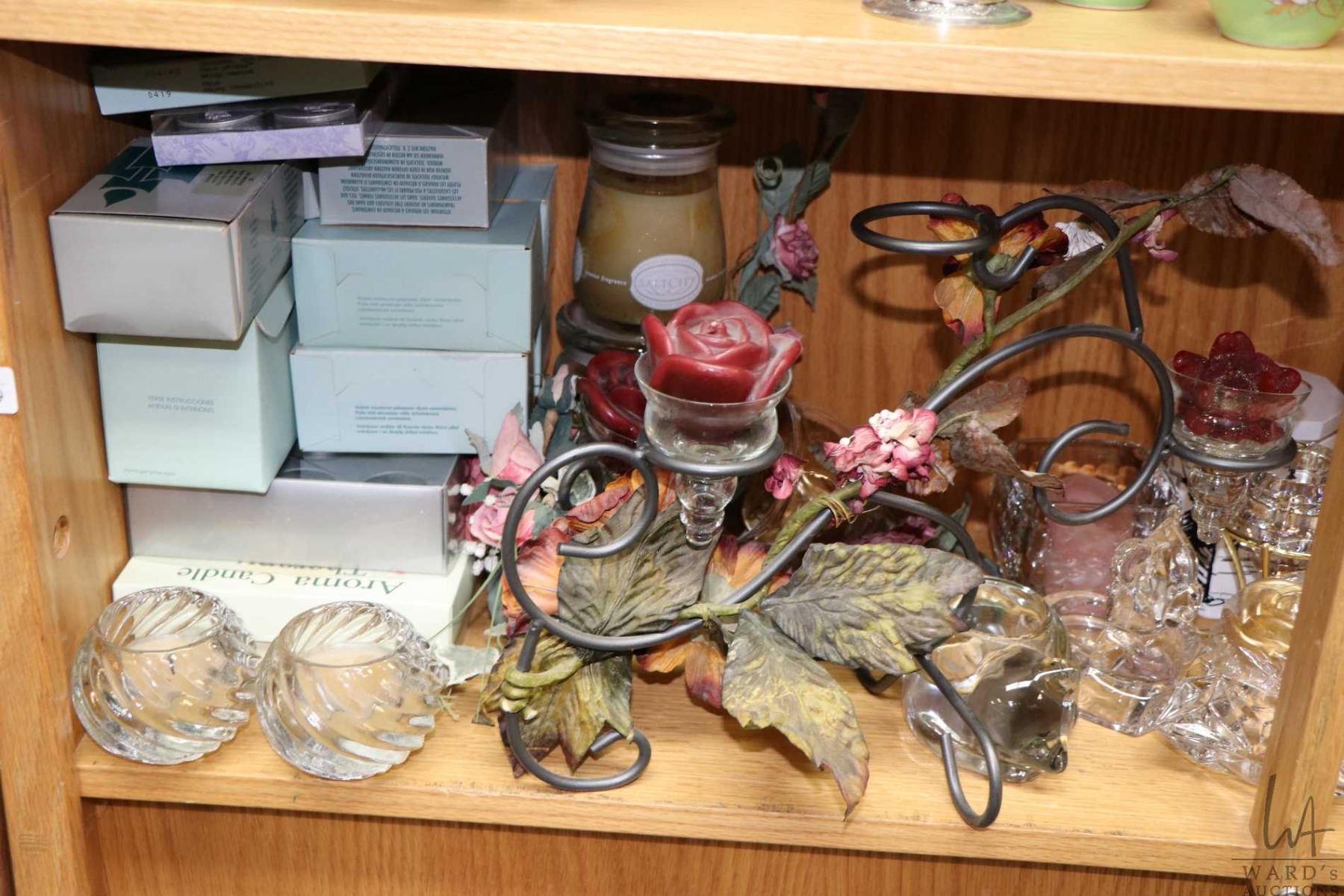 Shelf lot of collectible decor items including two small jade trees, wrought iron candleholders, glass candleholders, small clock, candles etc.