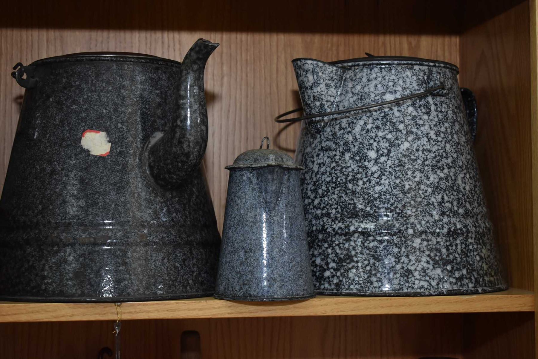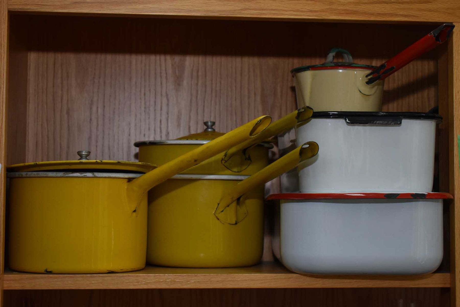 Shelf lot of collectible enamel ware including two large kettles, roasting pans, double boiler etc. Not Available For Shipping. Local Bidders Only