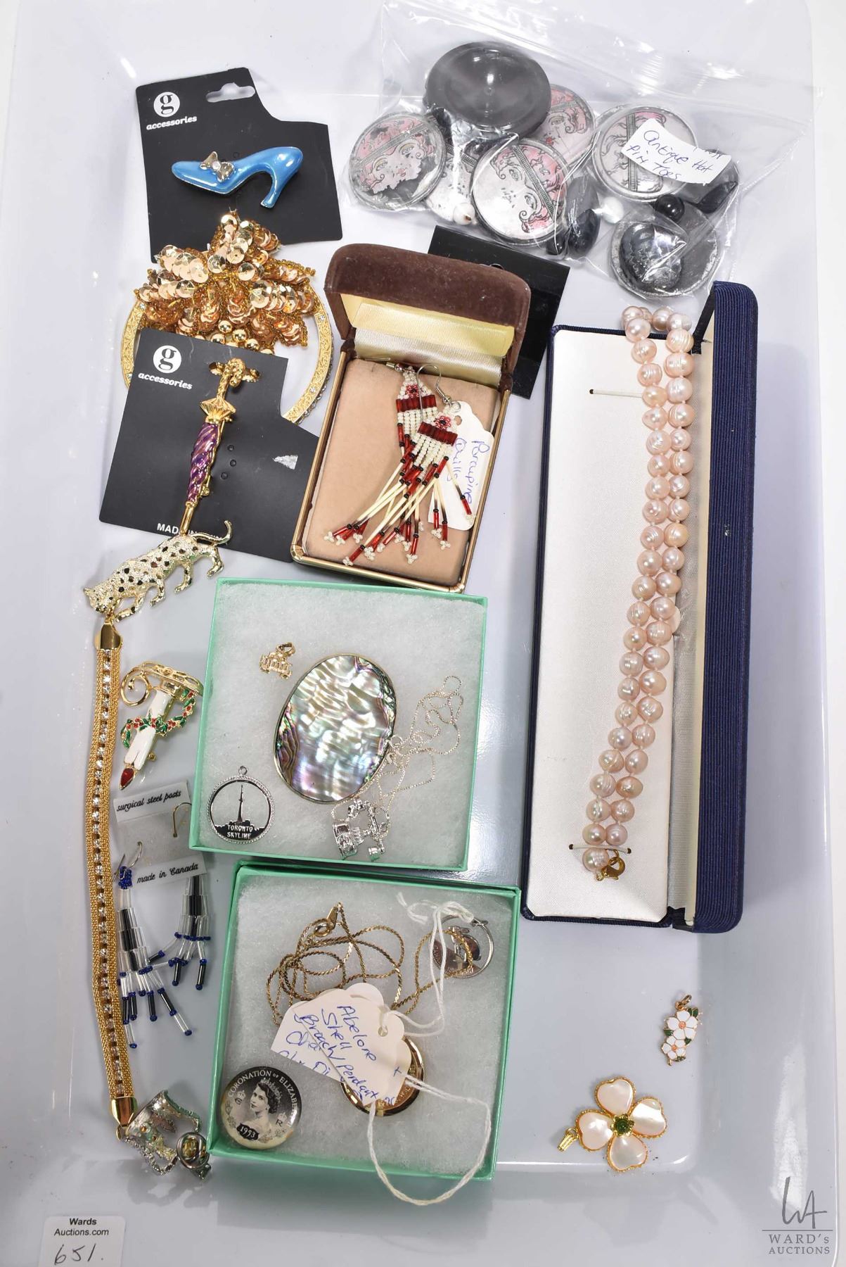 Shelf lot of collectible jewellery including silver and abalone shell brooch, sterling nekclace, genuine pink pearl necklace, gold filled Charles and Diana pendant, Porcupine Quill earrings, a selection of antique hat pin toppers, brooches, bracelets etc.