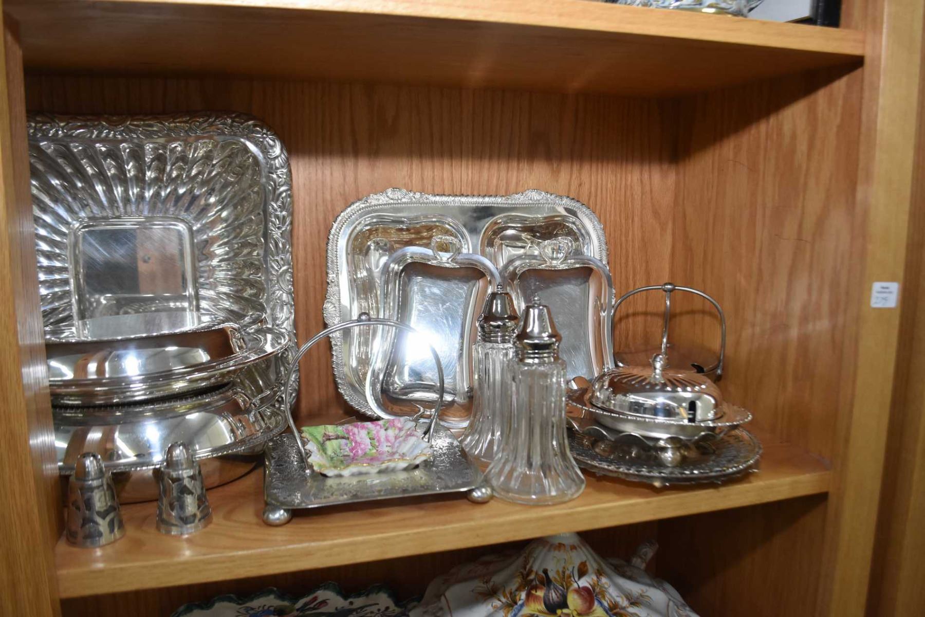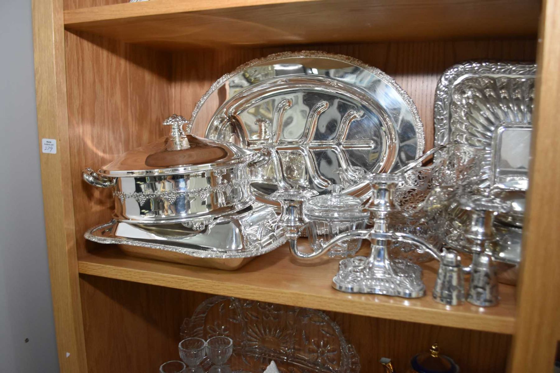 Shelf lot of collectible silver-plate including lidded casseroles, spooners, meat platter, three branch candelabra etc. plus four small glass and sterling silver wrapped shakers