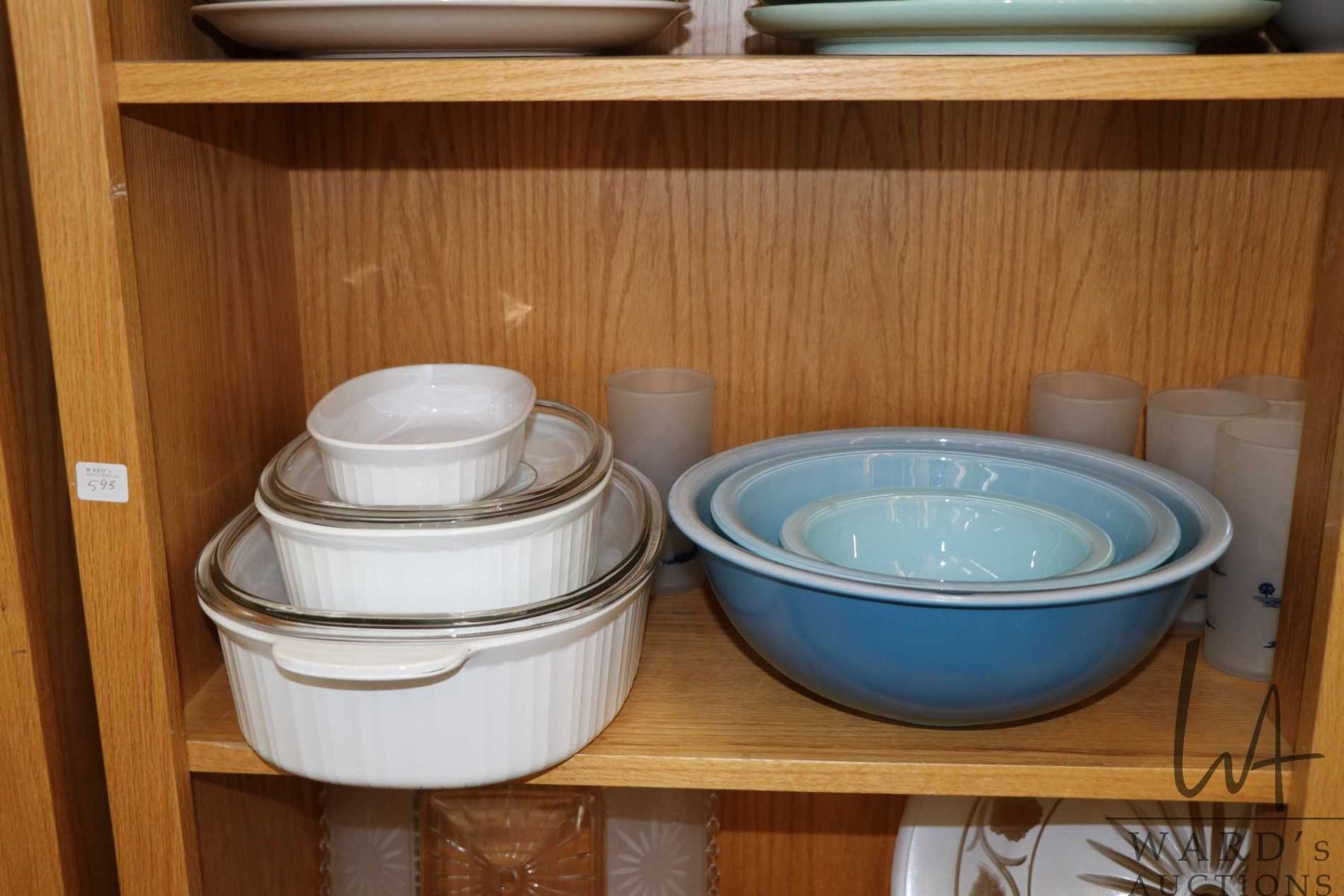 Shelf lot of collectibles including Corningware, Pyrex, satin tumblers etc. Note: Not available for shipping. Local pickup only
