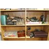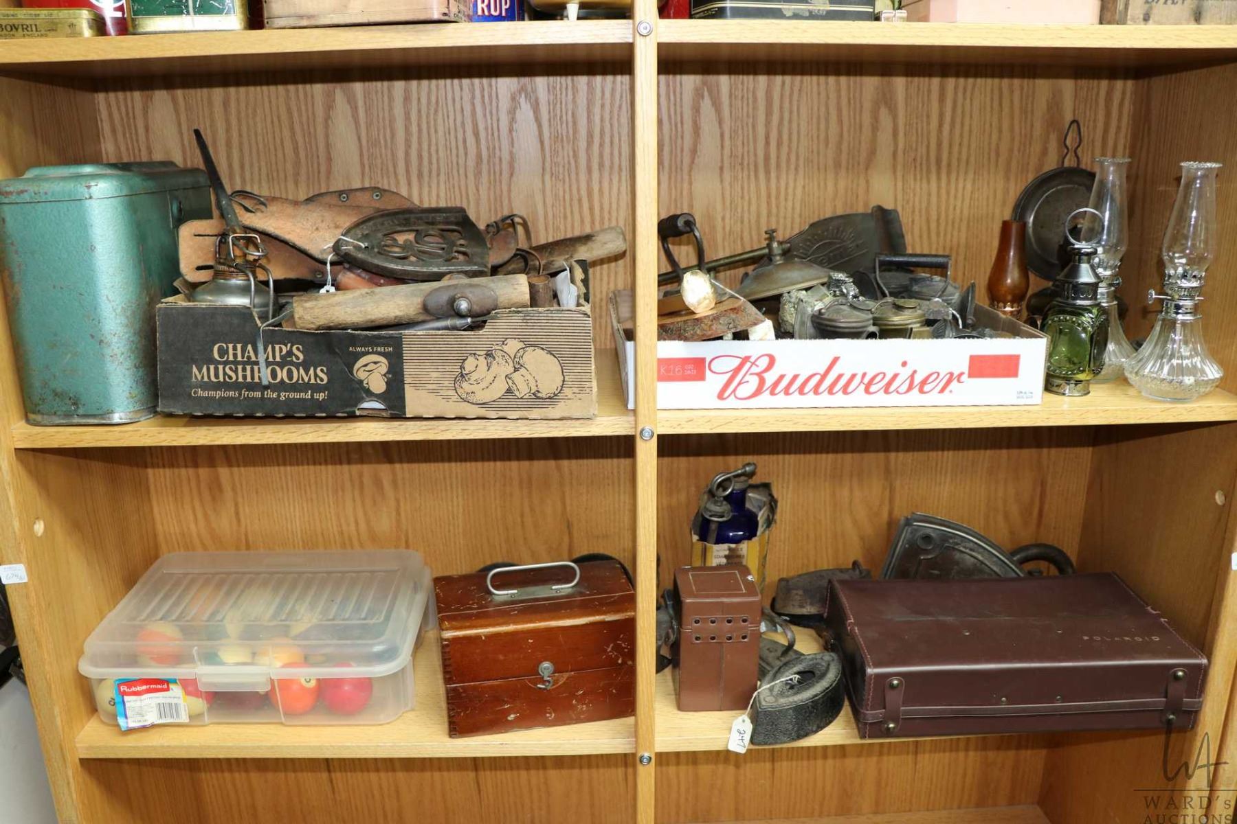 Shelf lot of collectibles including Polaroid camera in Polaroid case, sadirons, Medical quackery device etc. Note: Not available for shipping. Local pickup only