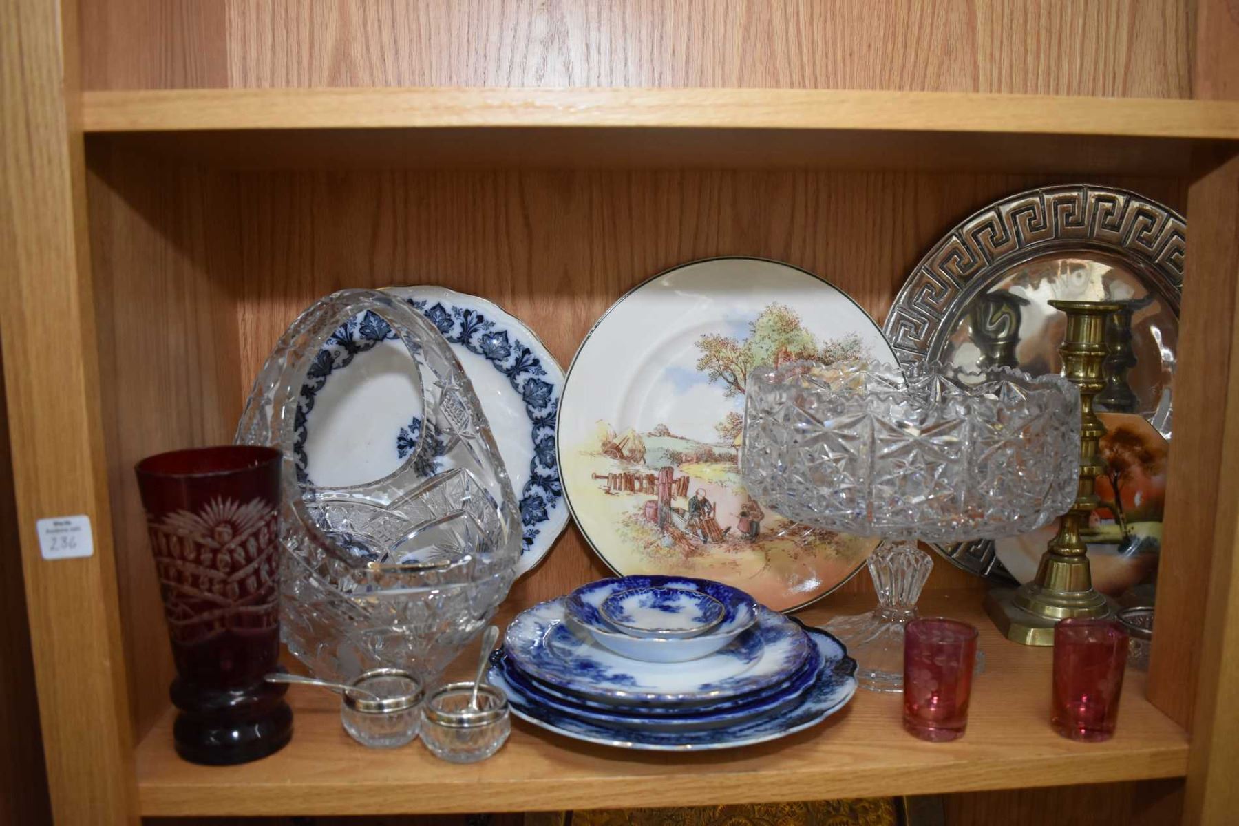 Shelf lot of collectibles including antique ruby flash cut to clear vase, crystal basket, Mkado platter, Flow blue including plates and sugar castor, china cups and saucers etc. Not available for shipping. Local bidders only