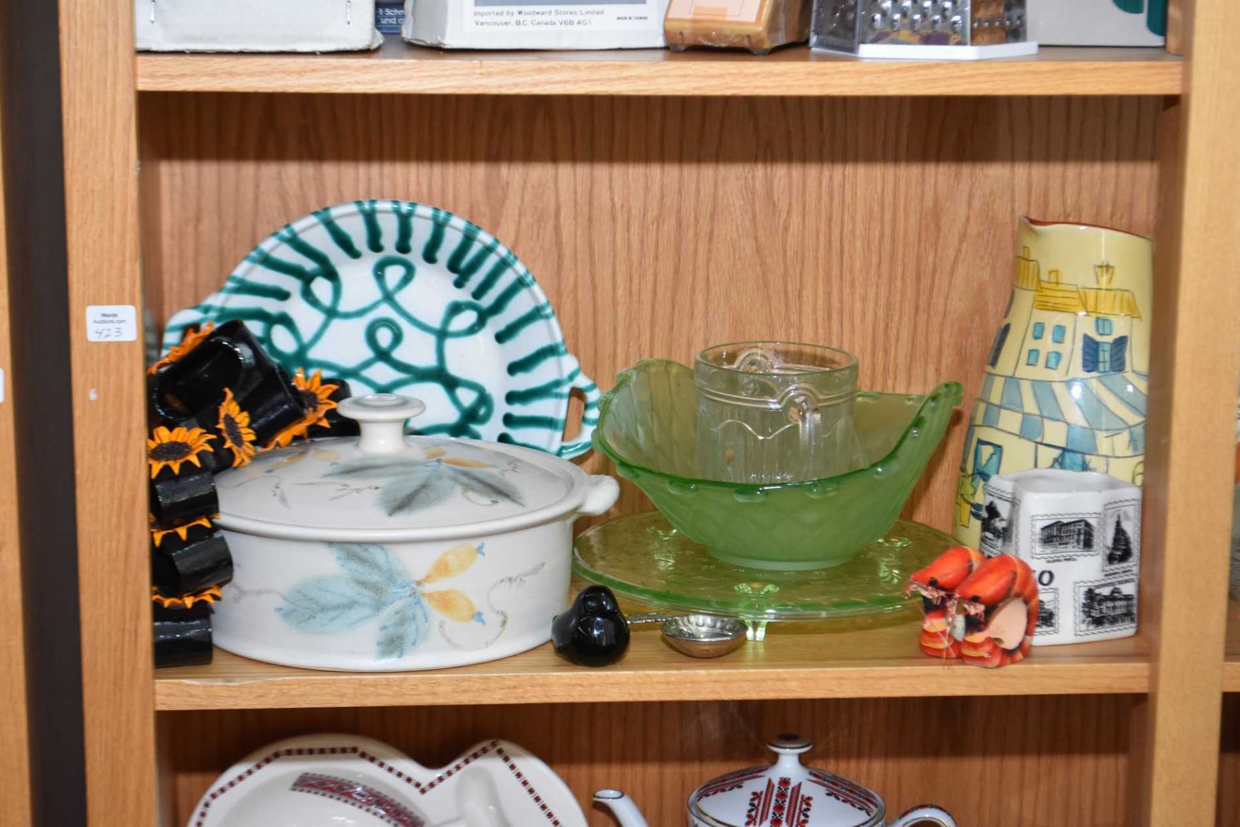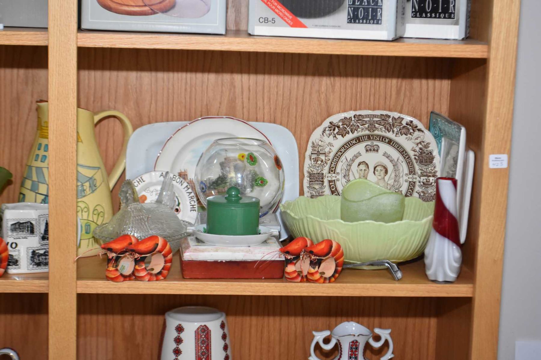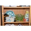 This item is not available for shipping. Local pickup only. Shelf lot of collectibles including lidded hand painted pottery casserole dish, juice jug, coloured glass, serving dishes, glass hen on nest, napkin holders etc.