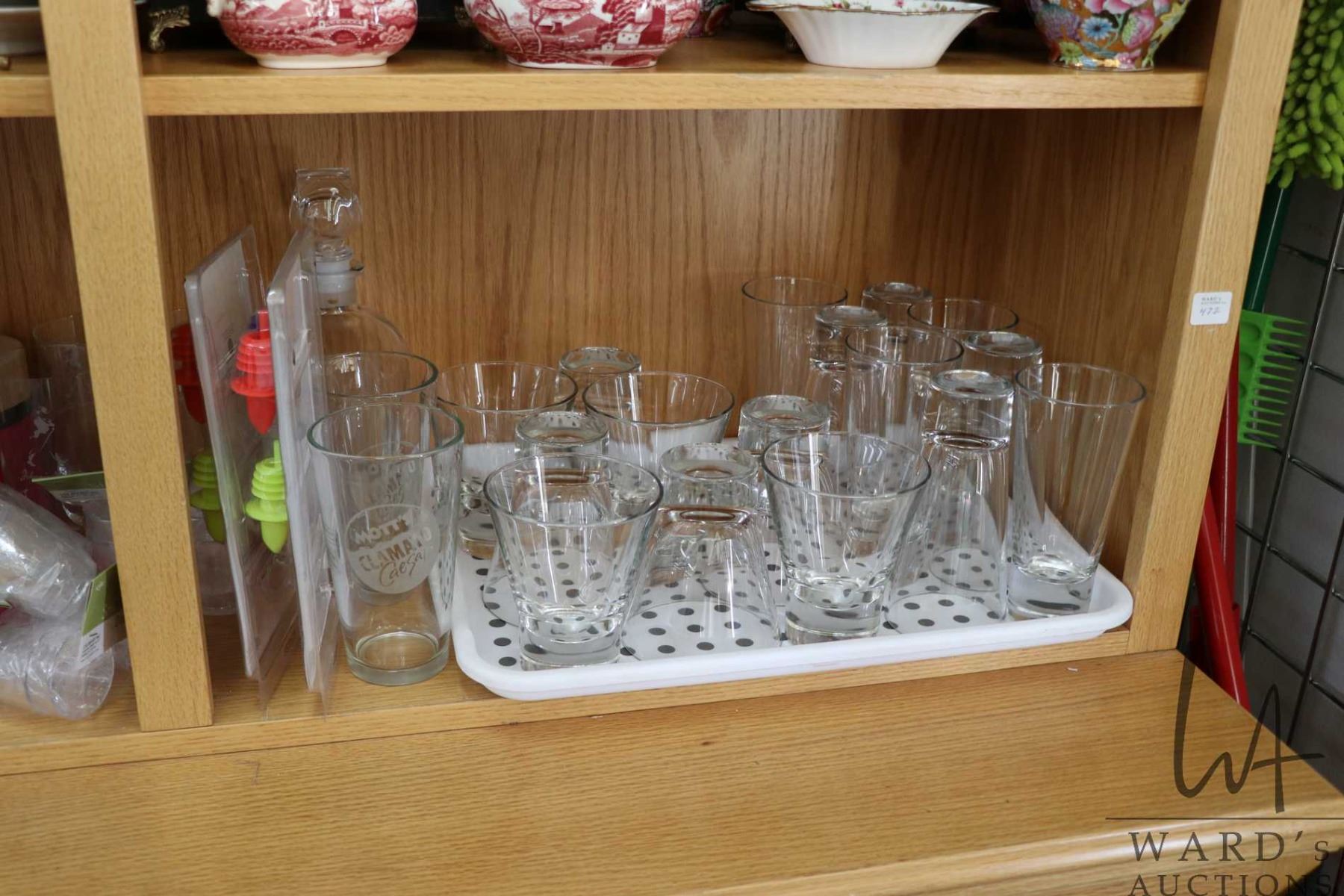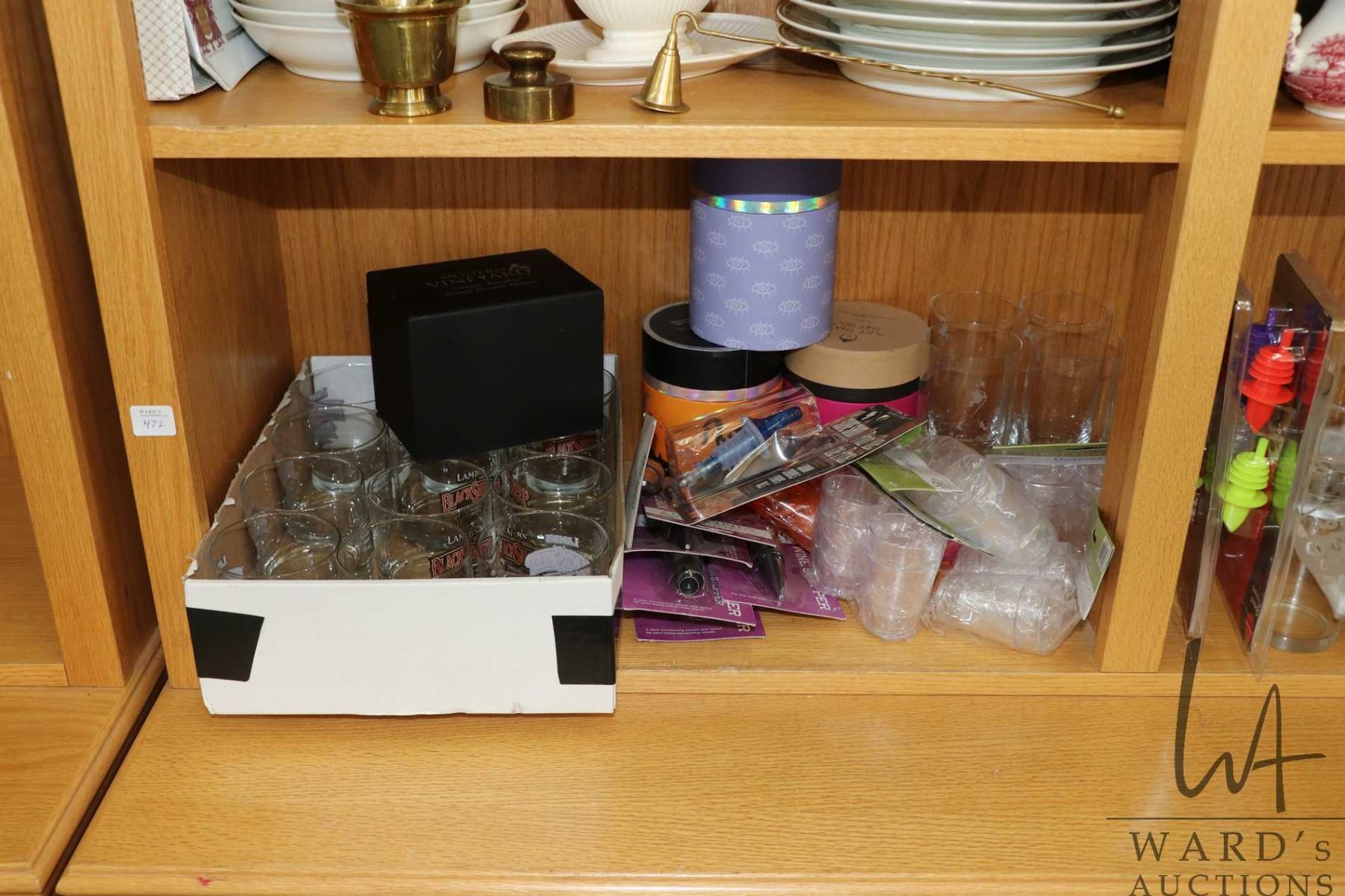 Shelf lot of new glassware including eight each of tall and short drinking glasses, twelve Lamb's Bl