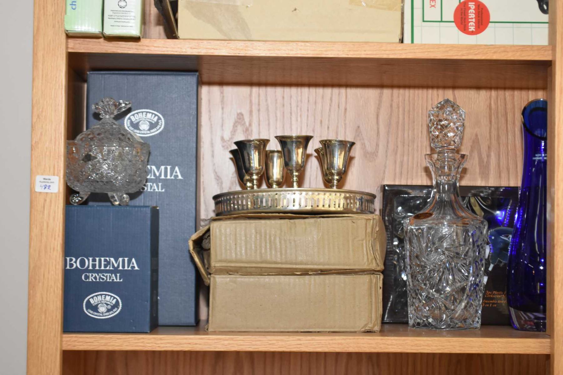 This item is not available for shipping. Local pickup only. Shelf lot of new in box crystal including stemware, tumblers, Bohemia crystal decanters, Polish cobalt crystal art glass vase, silver-plate trays with small aperitif glasses etc.