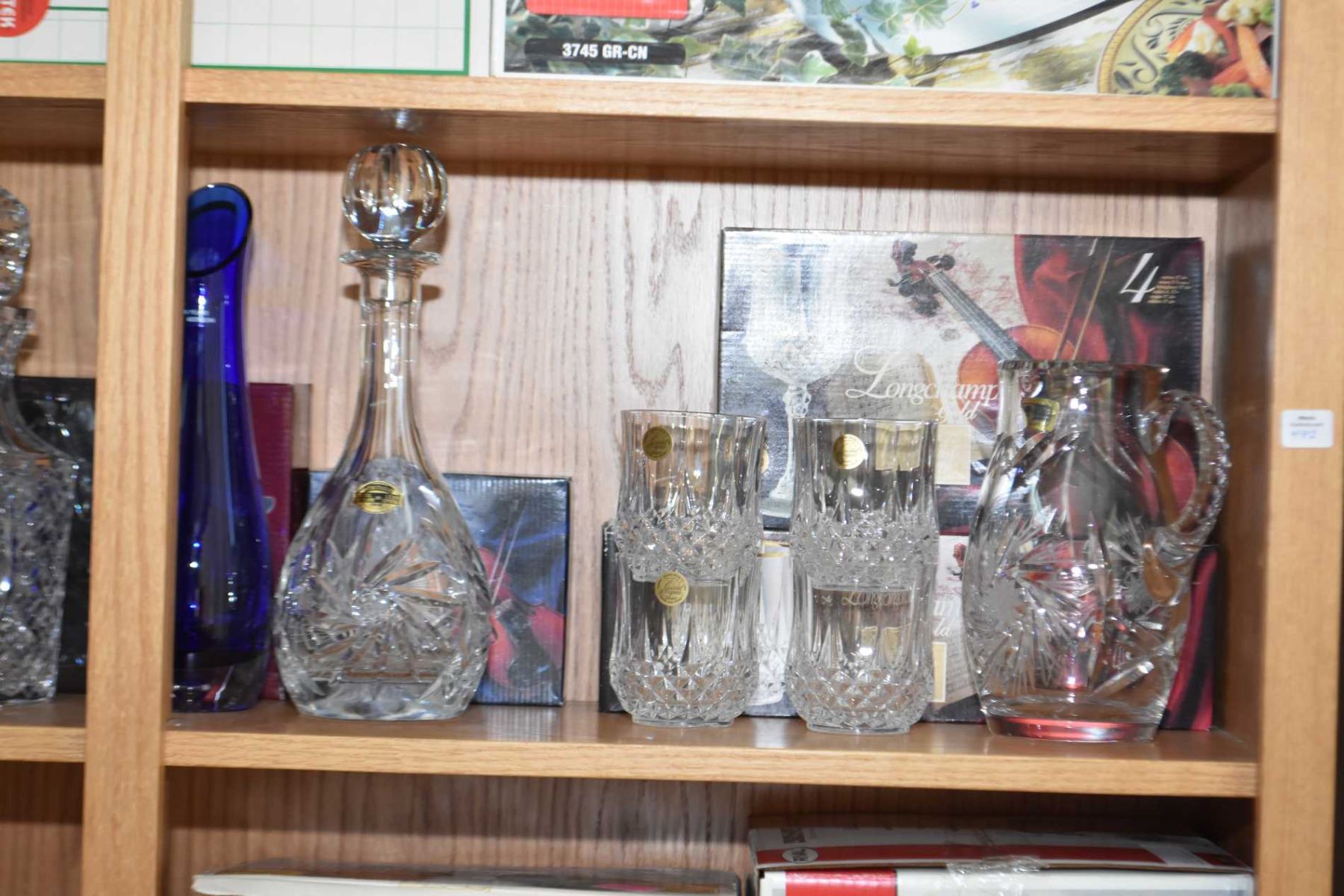 Shelf lot of new in box crystal including stemware, tumblers, Bohemia crystal decanters, Polish coba