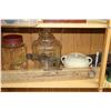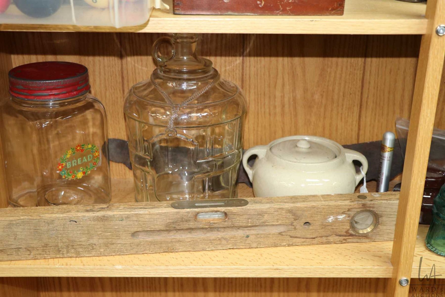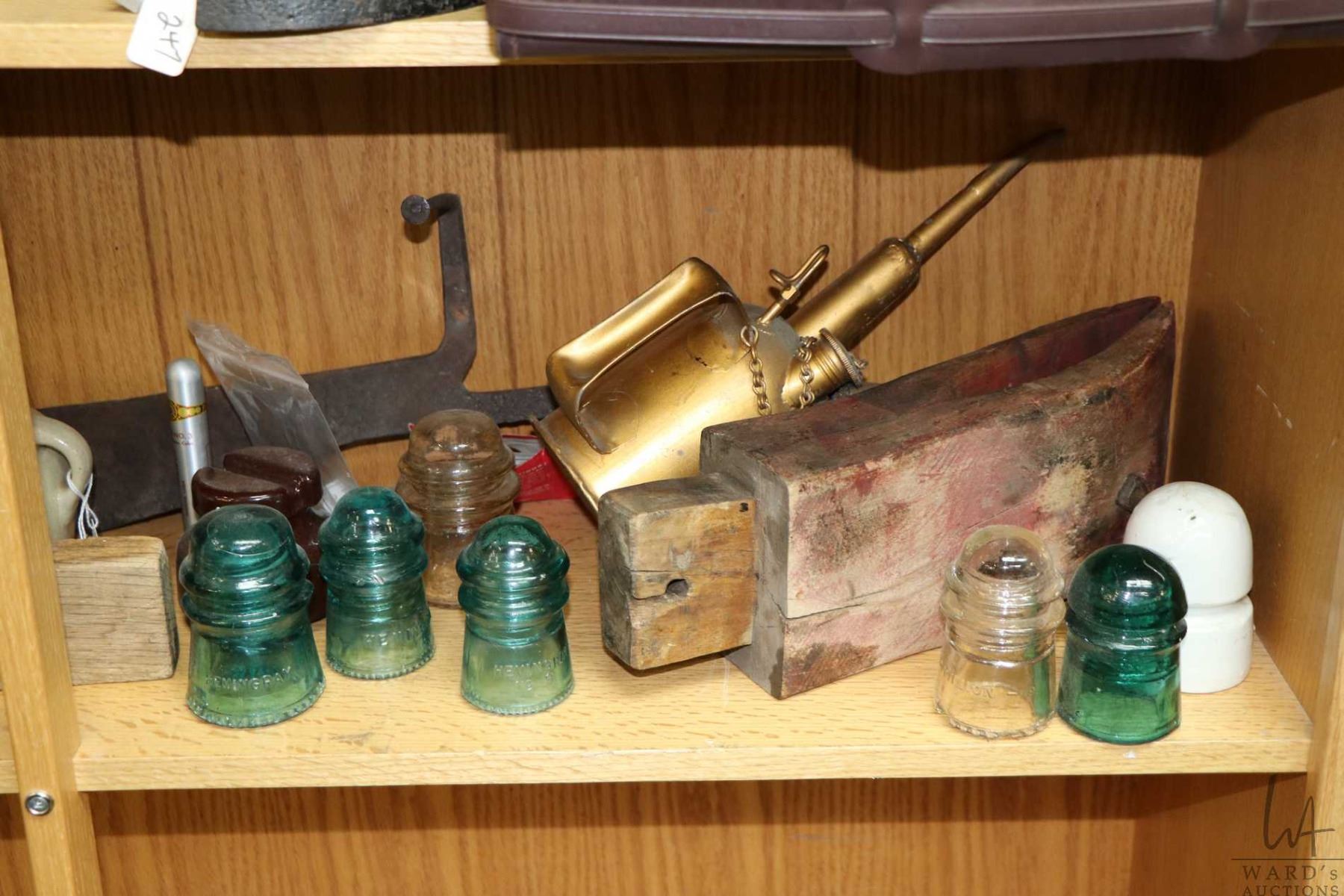 Shelf lot of primitive collectibles including wood and brass level, saddle bench clamp, glass and porcelain insulators, bean pot, oil can, large sealers etc.
