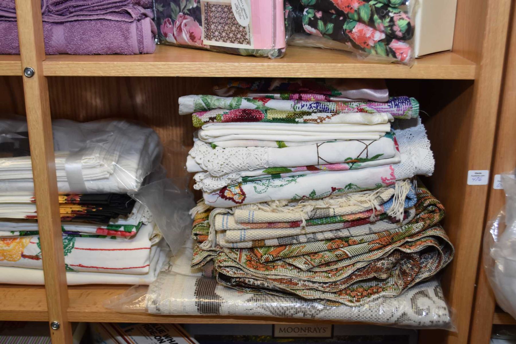 Shelf lot of table linens including new in package table clothes including Damask with matching napkins, plus embroidered clothes and napkins