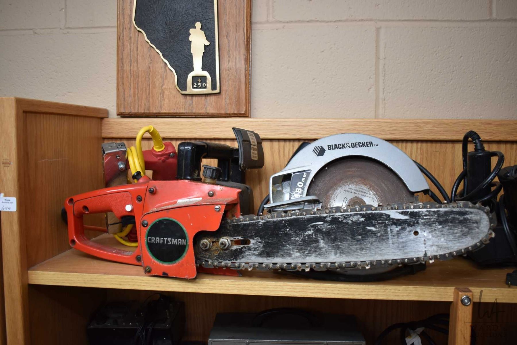 Shelf lot of tools including chain saw, bench grinder, electric stapler etc. all tested and working at time of cataloguing. Note: No Shipping. Local Pickup Only
