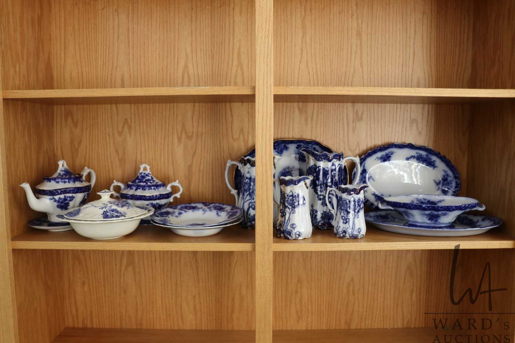 Shelf lot of vintage and antique blue and white pottery including Flow Blue, teapot, large lidded sugar bowl, graduated set of pitchers, three oval platters, oval double handled dish, two soup bowls, lidded serving dish marked Arcadia etc.