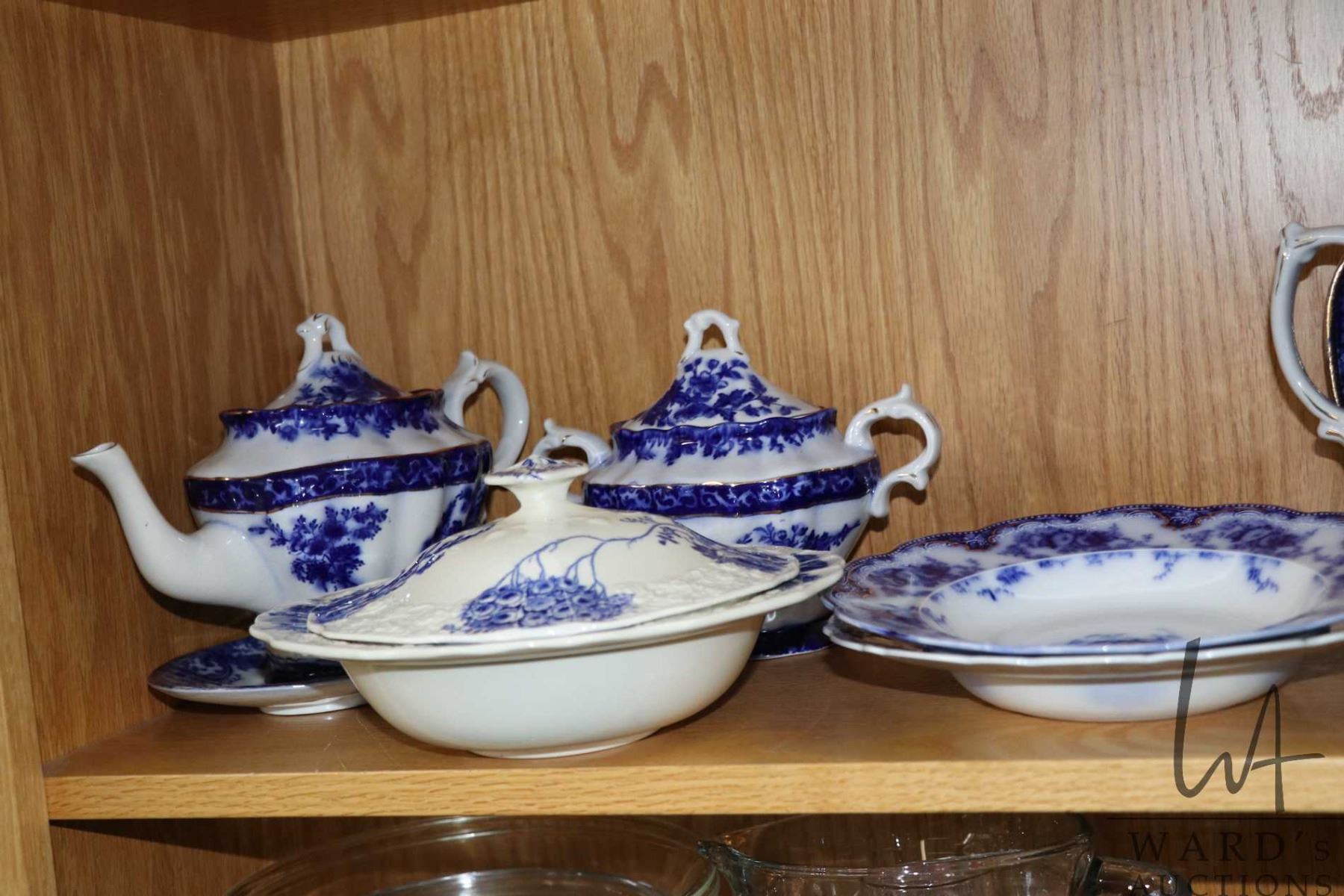 Shelf lot of vintage and antique blue and white pottery including Flow Blue, teapot, large lidded su