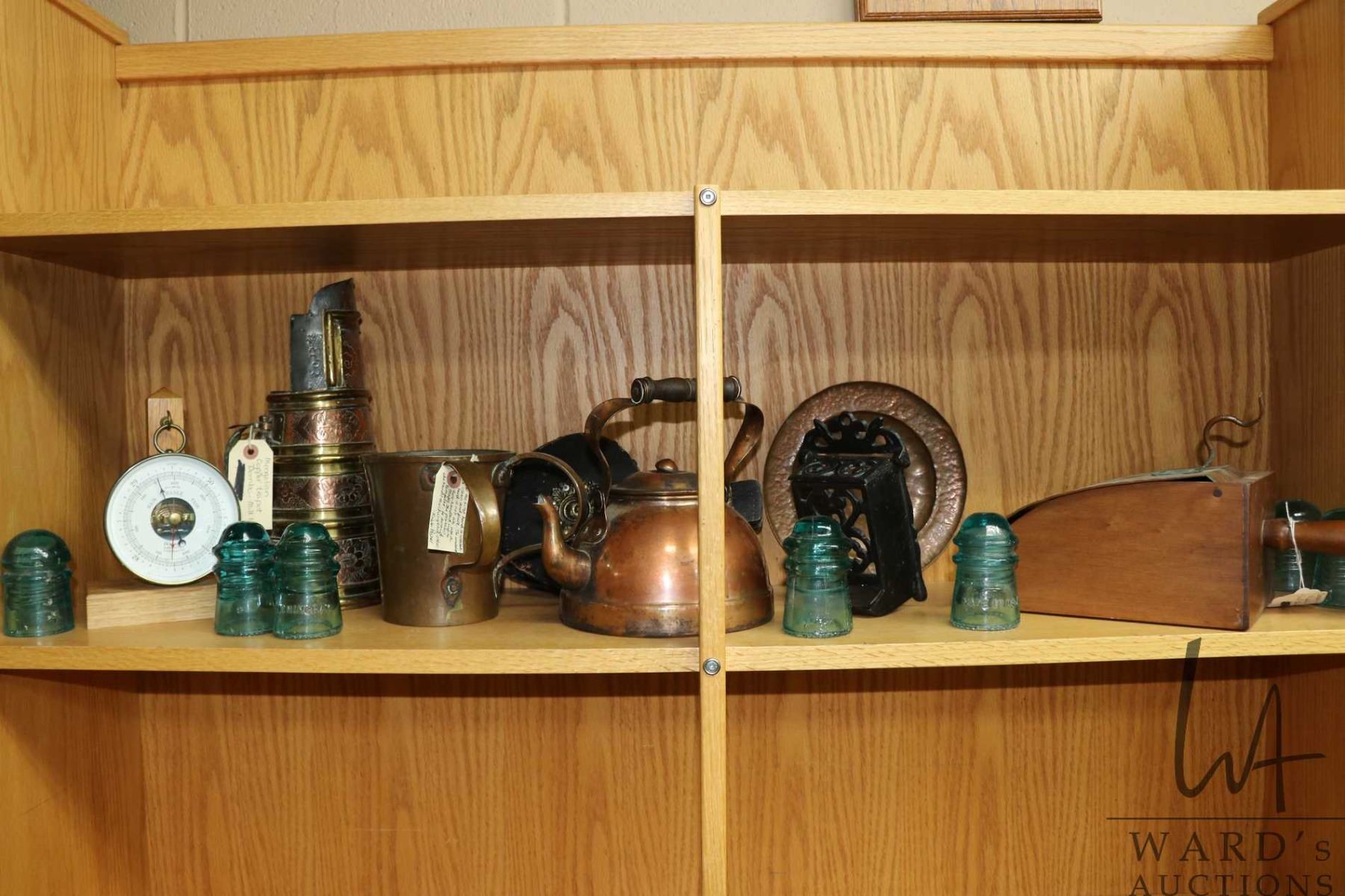 Shelf lot of vintage and antique collectibles including Mongolian milk tea pot, copper tea pot, copper coal shovel with maple handle, 5 3/4" hand made, double handled Jewish ritual cup, small bellows, Arigules barometer and a selection of glass insulators etc. Note: Not available for shipping. Local pickup only