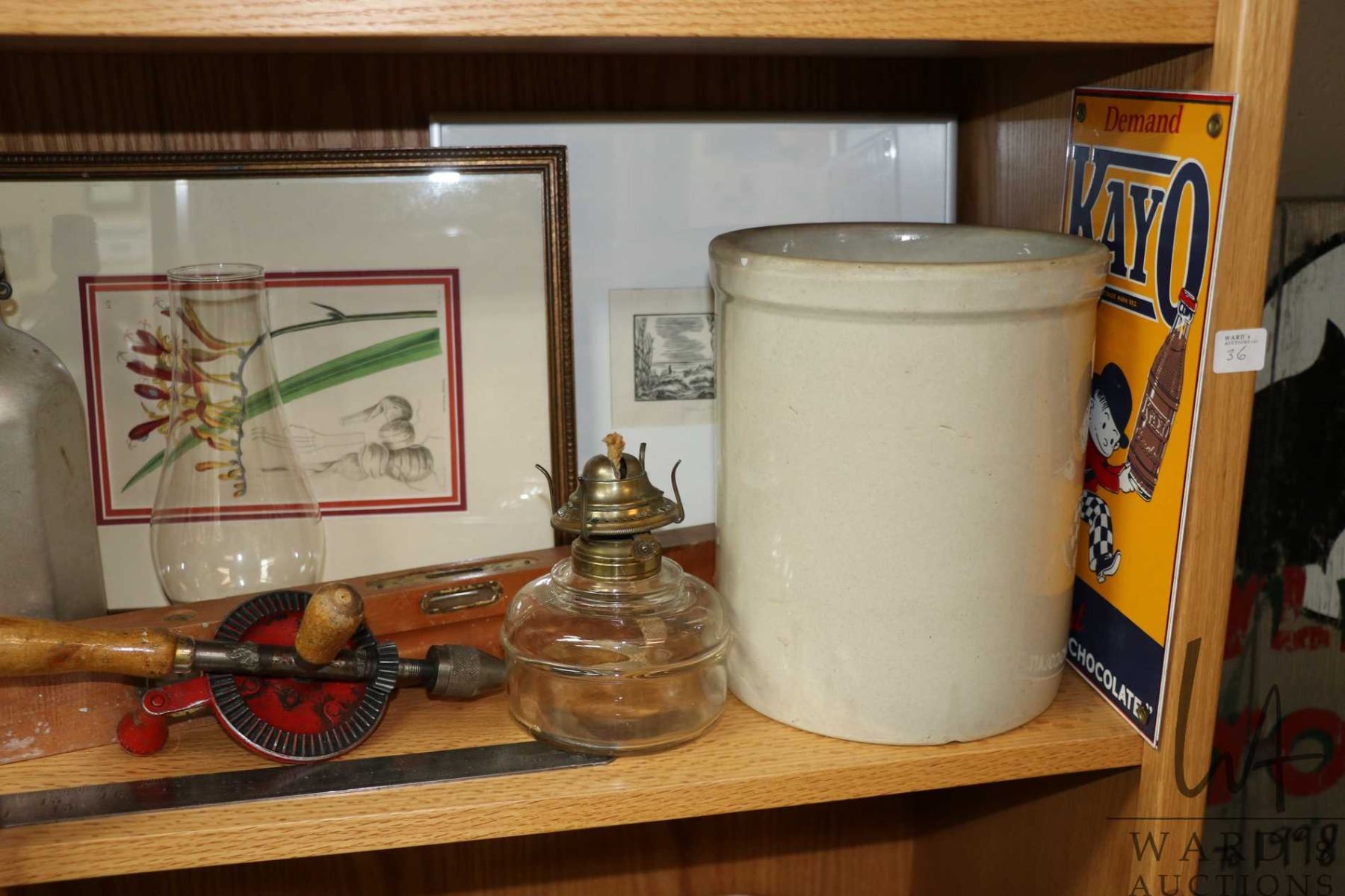 Shelf lot of vintage and antique collectibles including sadiron, one gallon stoneware crock, oil lamp, three American car license plates, crystal water jug, metal jelly mold, assortment on hand tools including hand drill, level, and a metal 24" tape measure, tin signs, framed floral print, and a framed miniature etching etc.