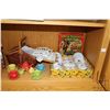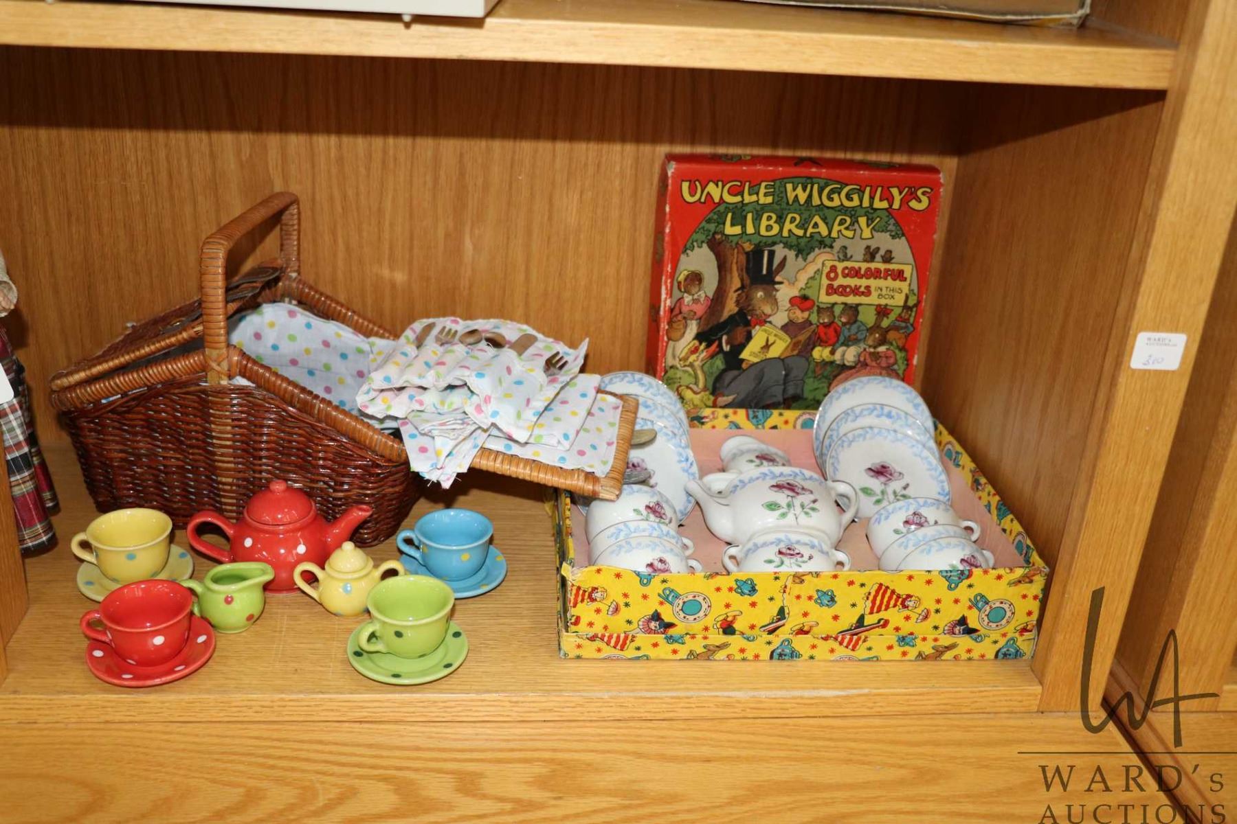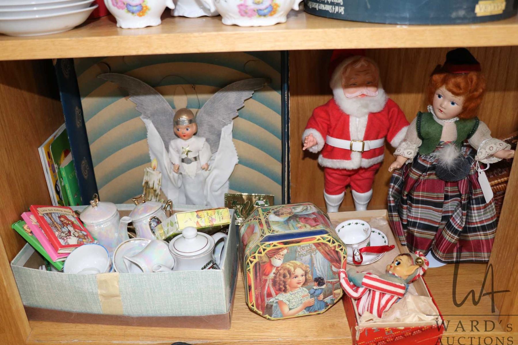 Shelf lot of vintage and collectible toys including Santa, angel tree topper, lusterware tea set, floral miniature tea set in original box, doll's picnic basket, children's books etc.