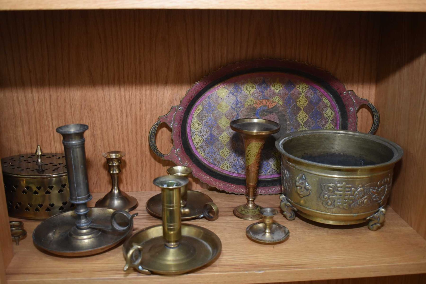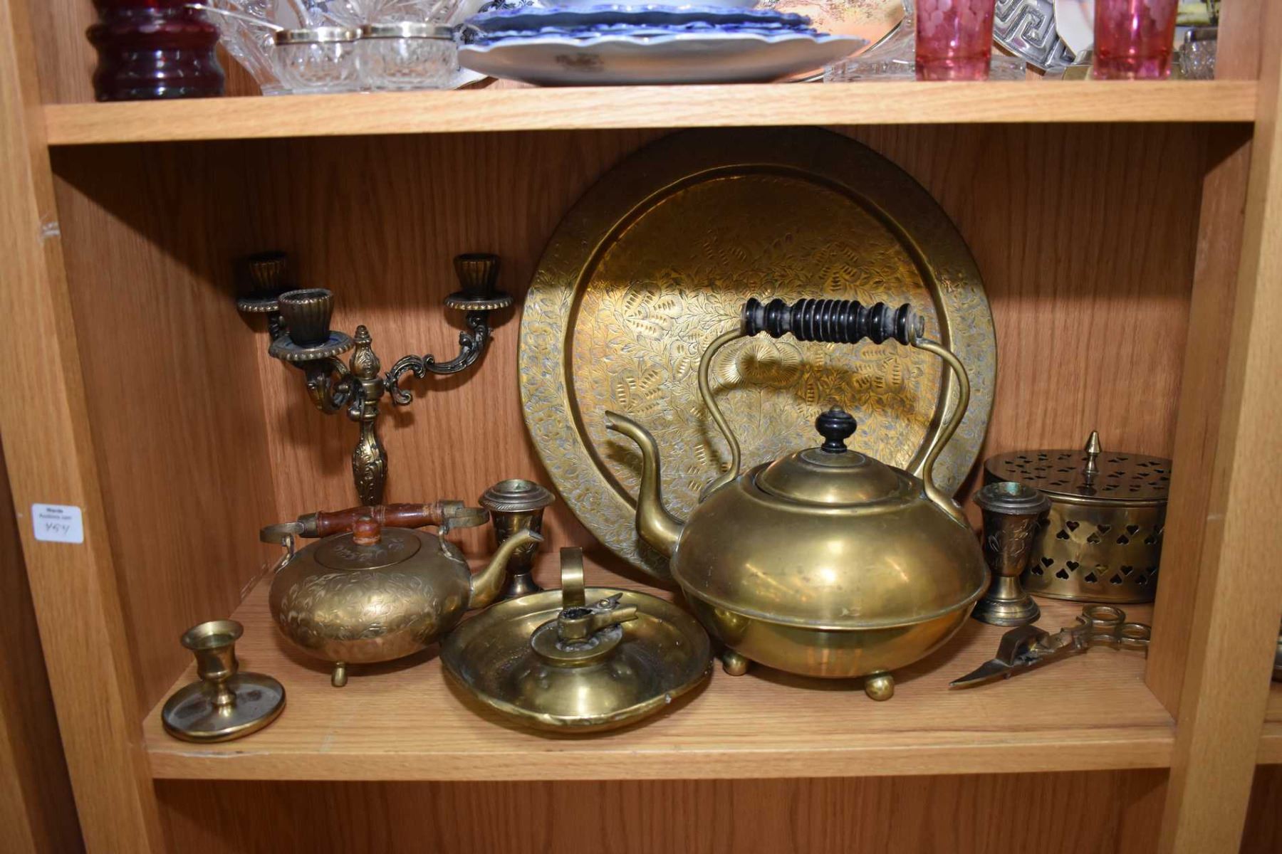 Shelf lot of vintage brass including kettles, candleholders, chargers etc. Not available for shipping. Local bidders only