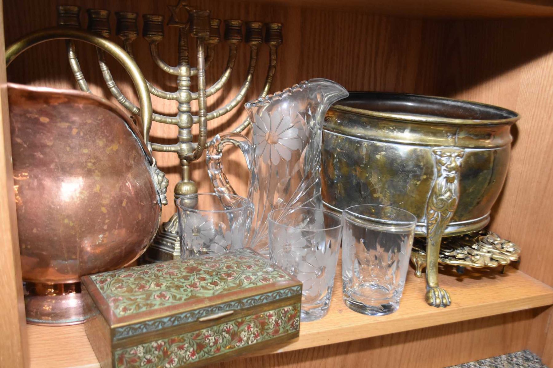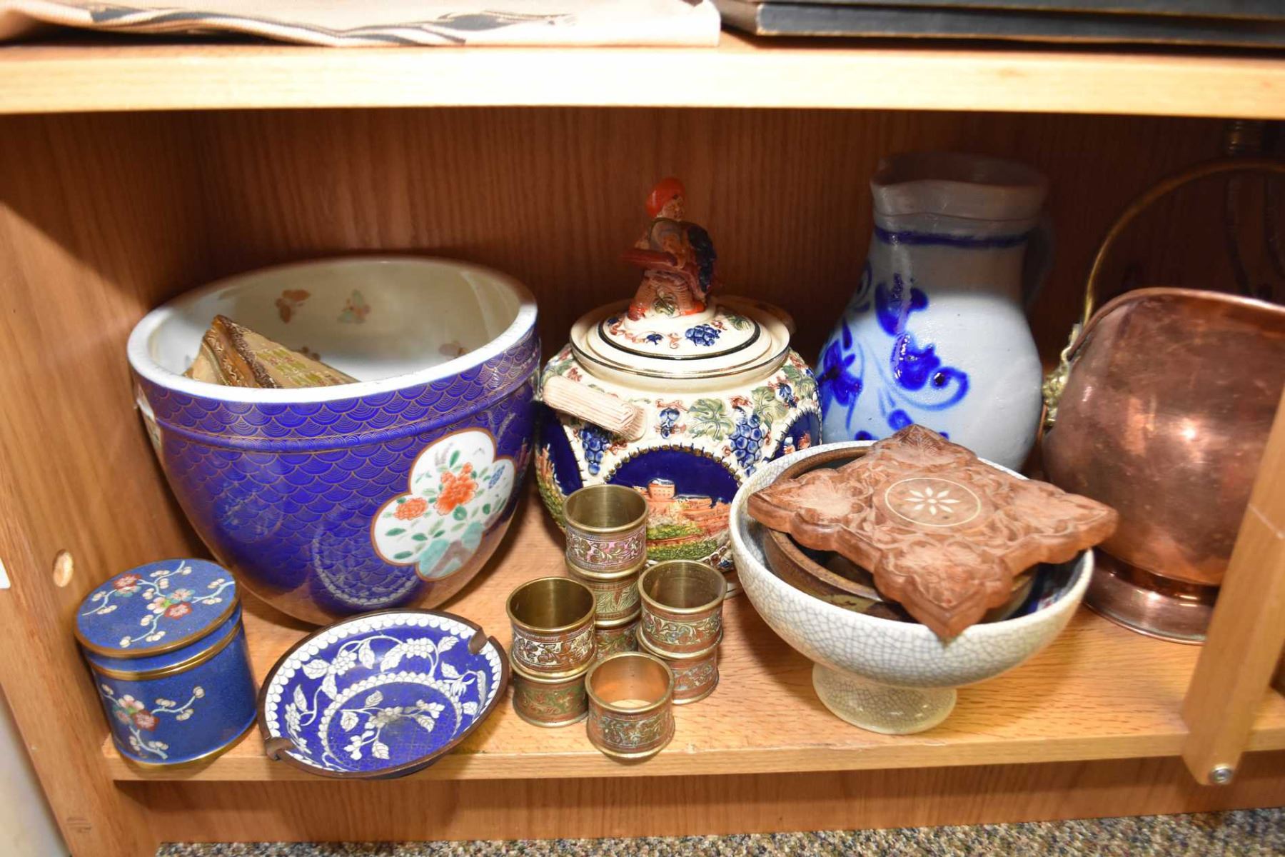This item is not available for shipping. Local pickup only. Shelf lot of vintage collectibles including Oriental plant pot, Cornflower crystal jug and tumblers, cloisonne, enamelled box, plant pots, brass etc.