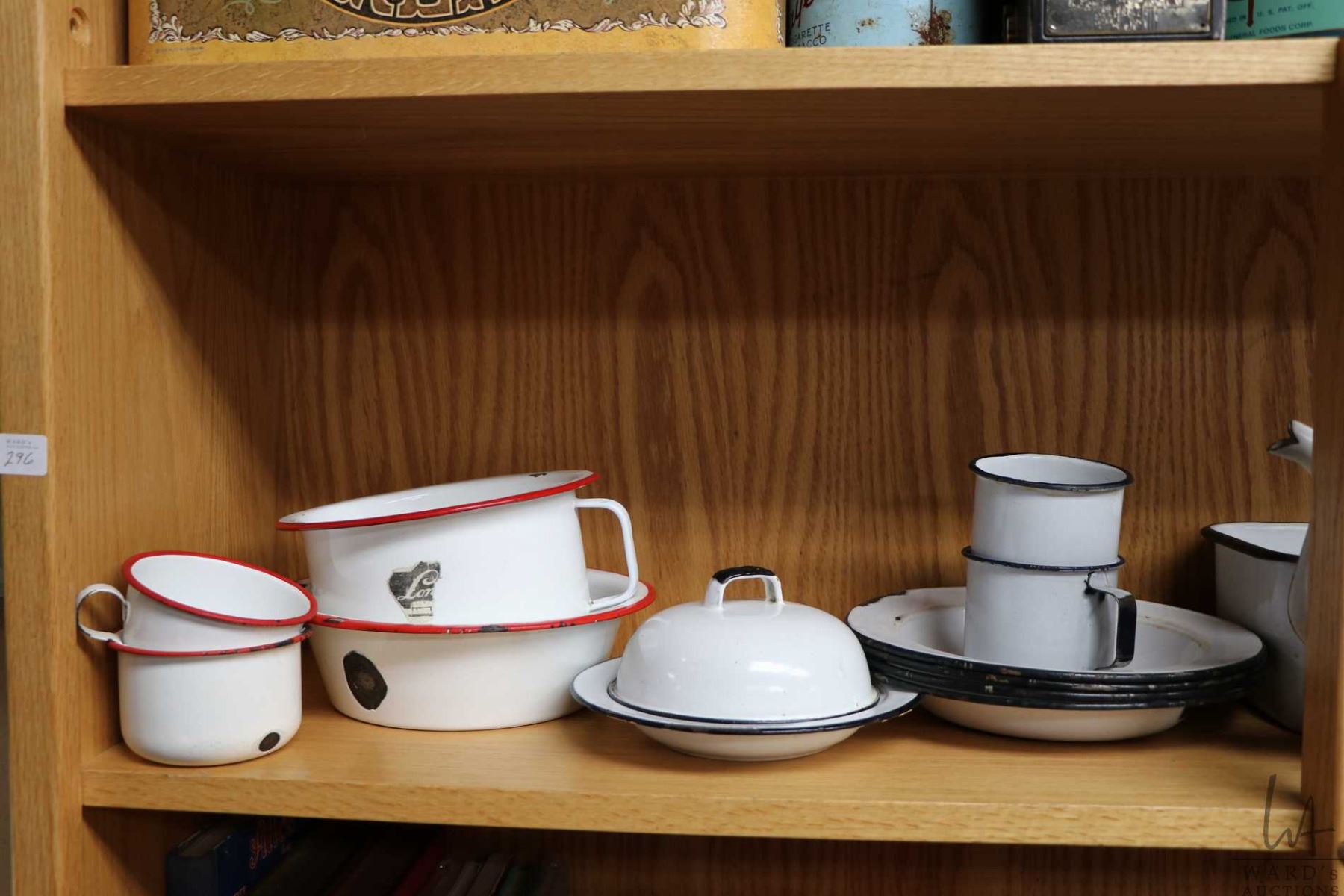 Shelf lot of vintage enamel ware including teapot, plates, pots, pans, cups, covered butter dish etc. Note: Not Available For Shipping. Local Pickup Only
