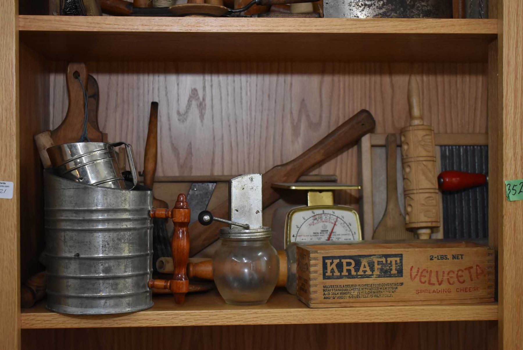 Shelf lot of vintage kitchen collectibles including glass butter churn, small mixer, scales, rolling pins including glass, milk glass juicers, spice shakers, spigot, small mandolins etc. Not Available For Shipping. Local Bidders Only