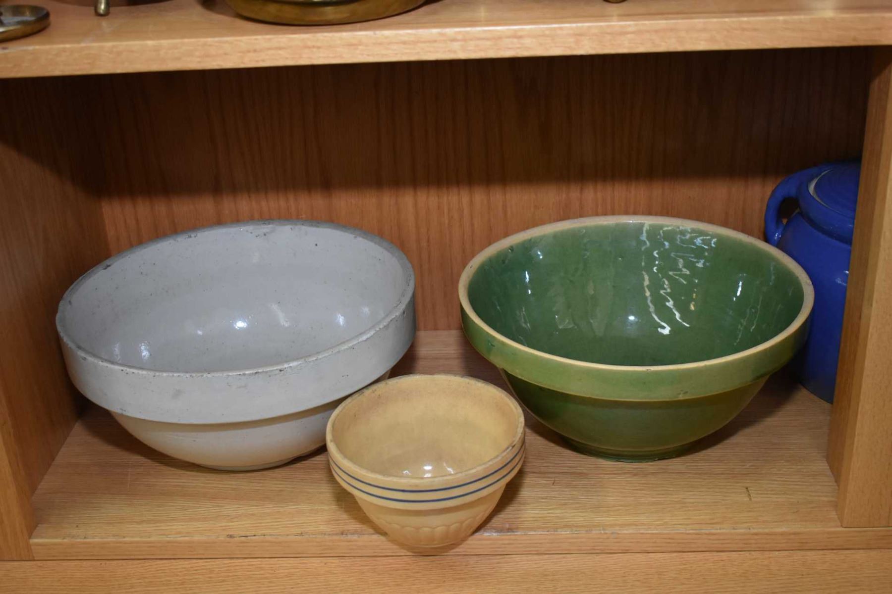Shelf lot of vintage pottery and stoneware including lidded pot and mixing bowls. Not available for shipping. Local bidders only