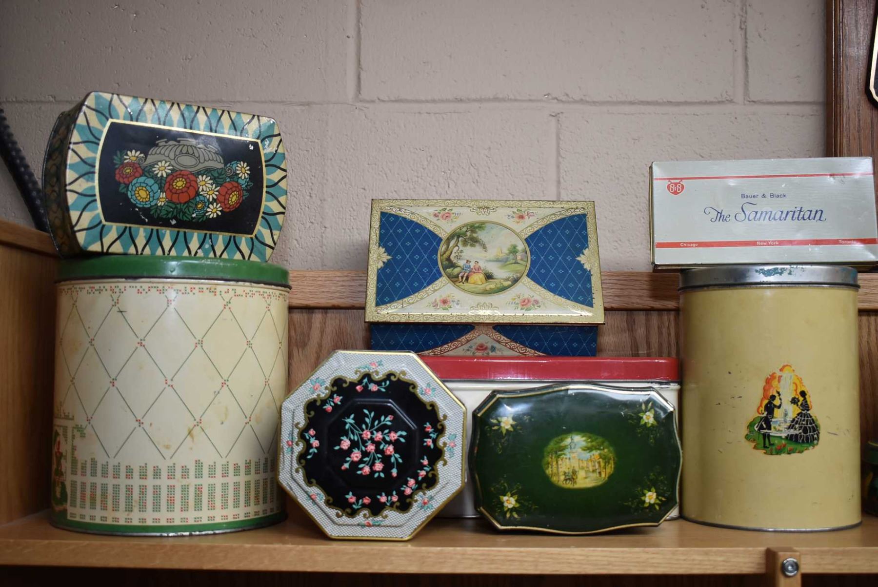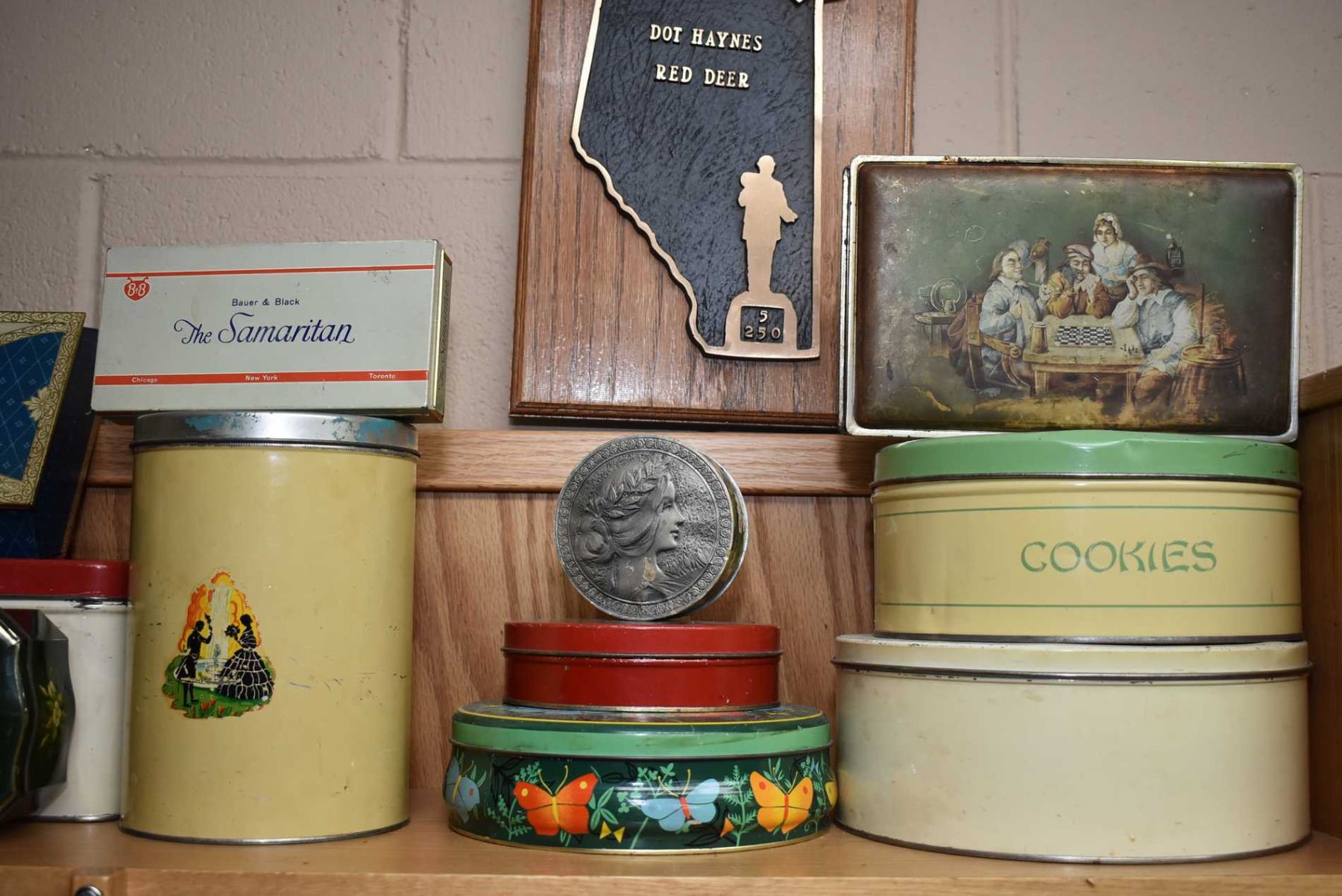 Shelf lot of vintage tins. Not available for shipping. Local pickup only