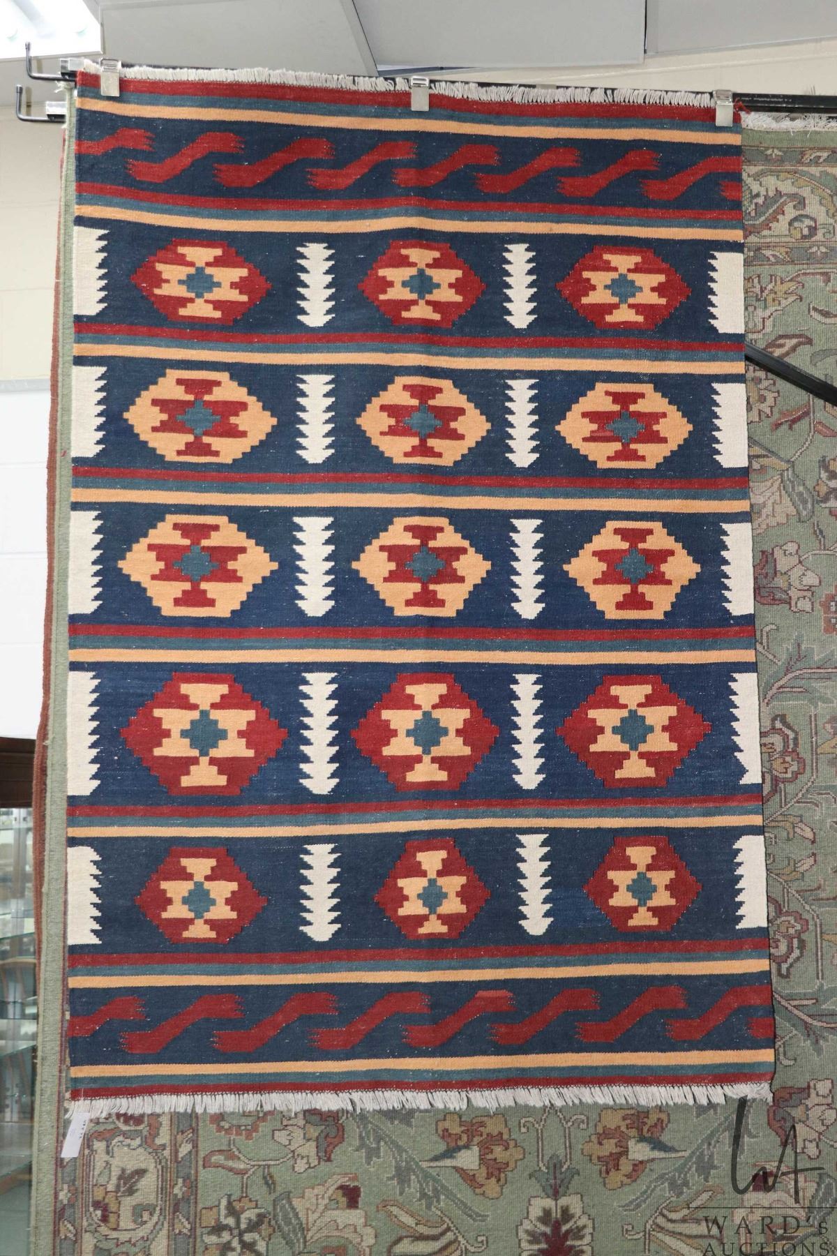Shiraz Kilim wool carpet with geometric design, blue background and highlights of red, cream and orange, 48" X 72"