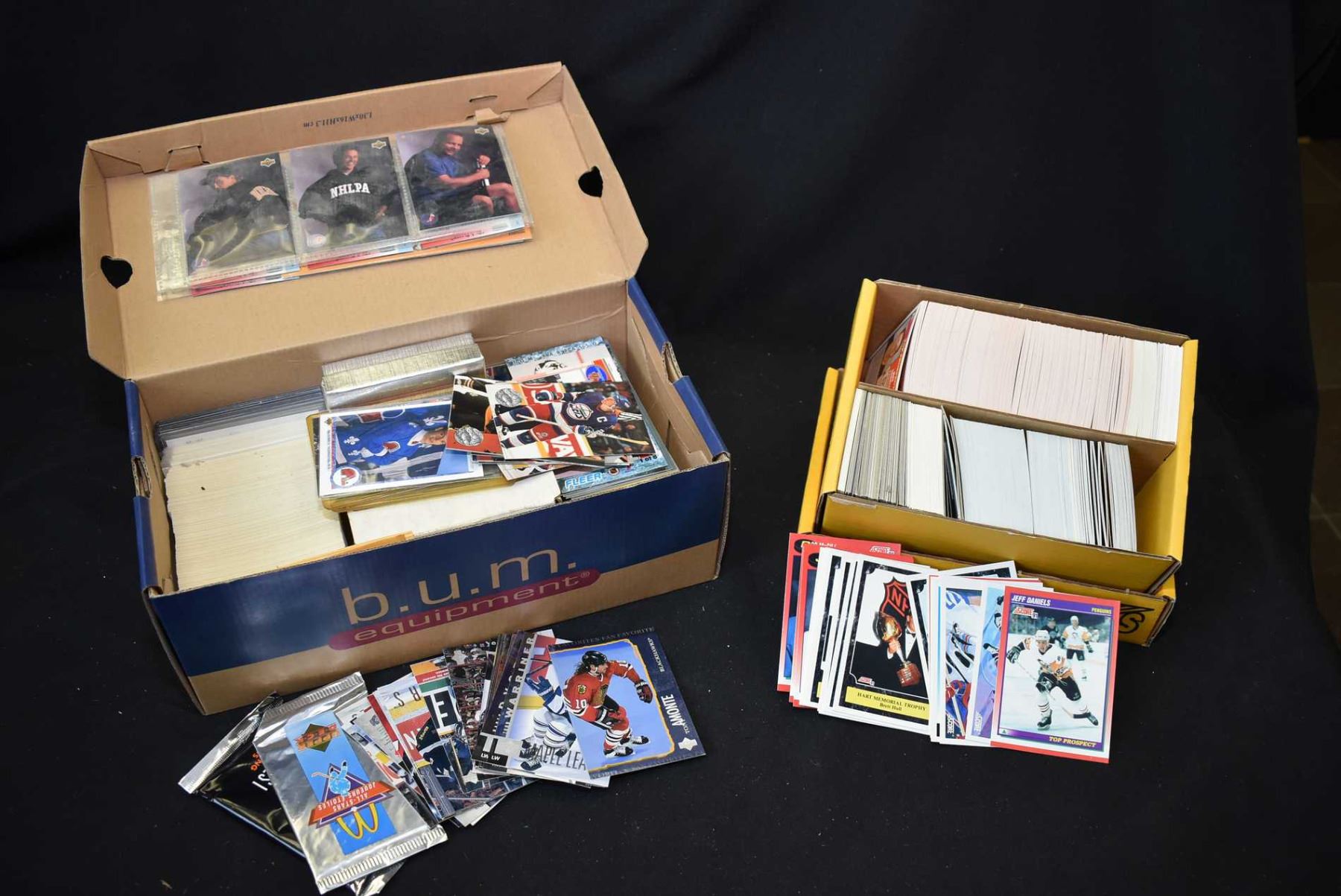 Shoe box filled with assorted collector cards including some unopened and an 800 count box of assorted hockey cards