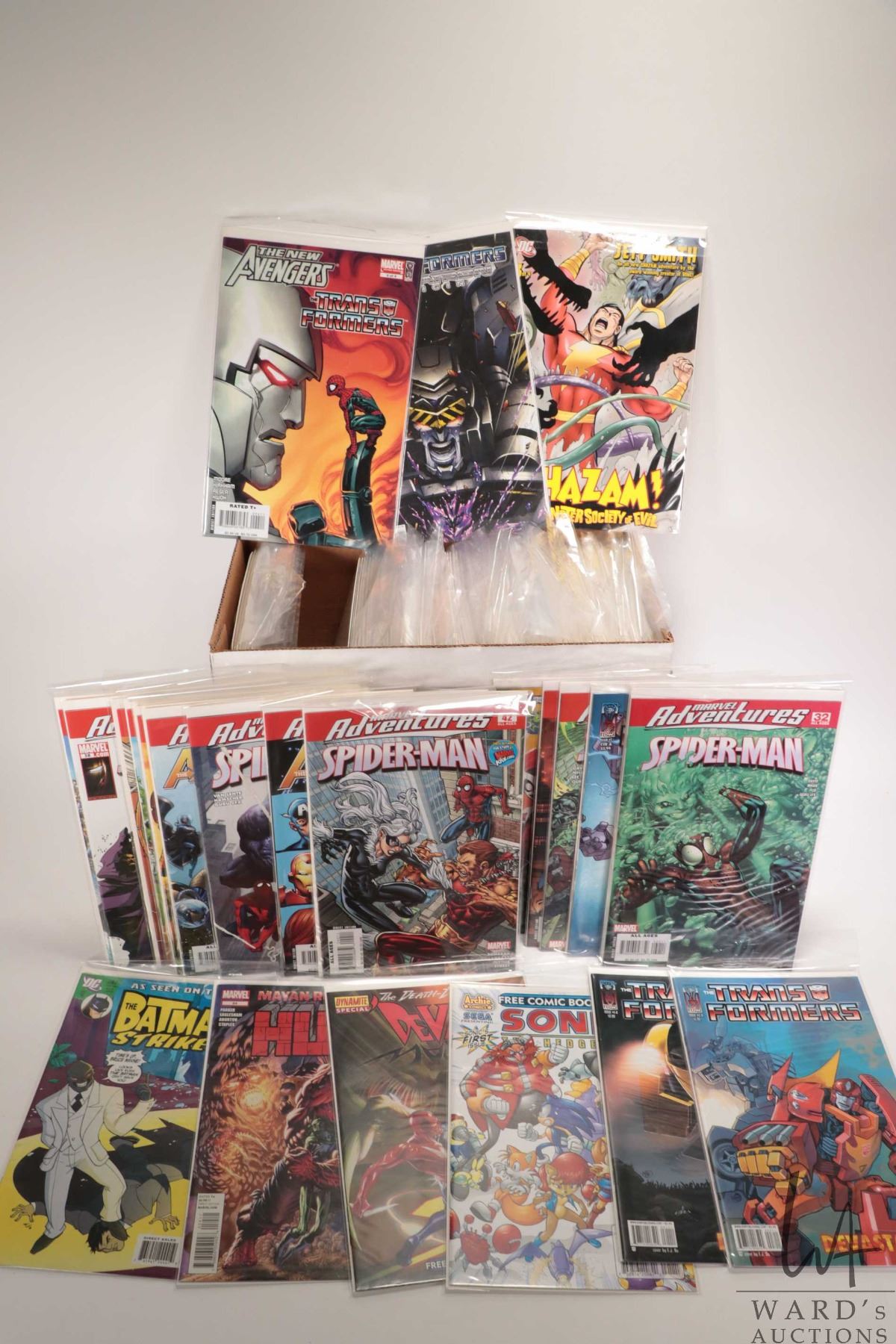 Short box of comics including "Marvel adventures", "transformers", "Teen Titans", etc.