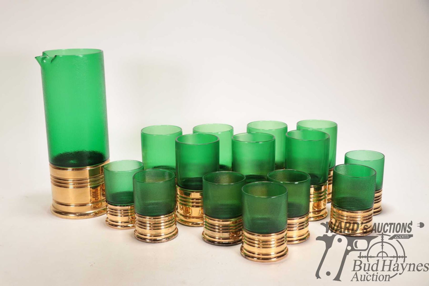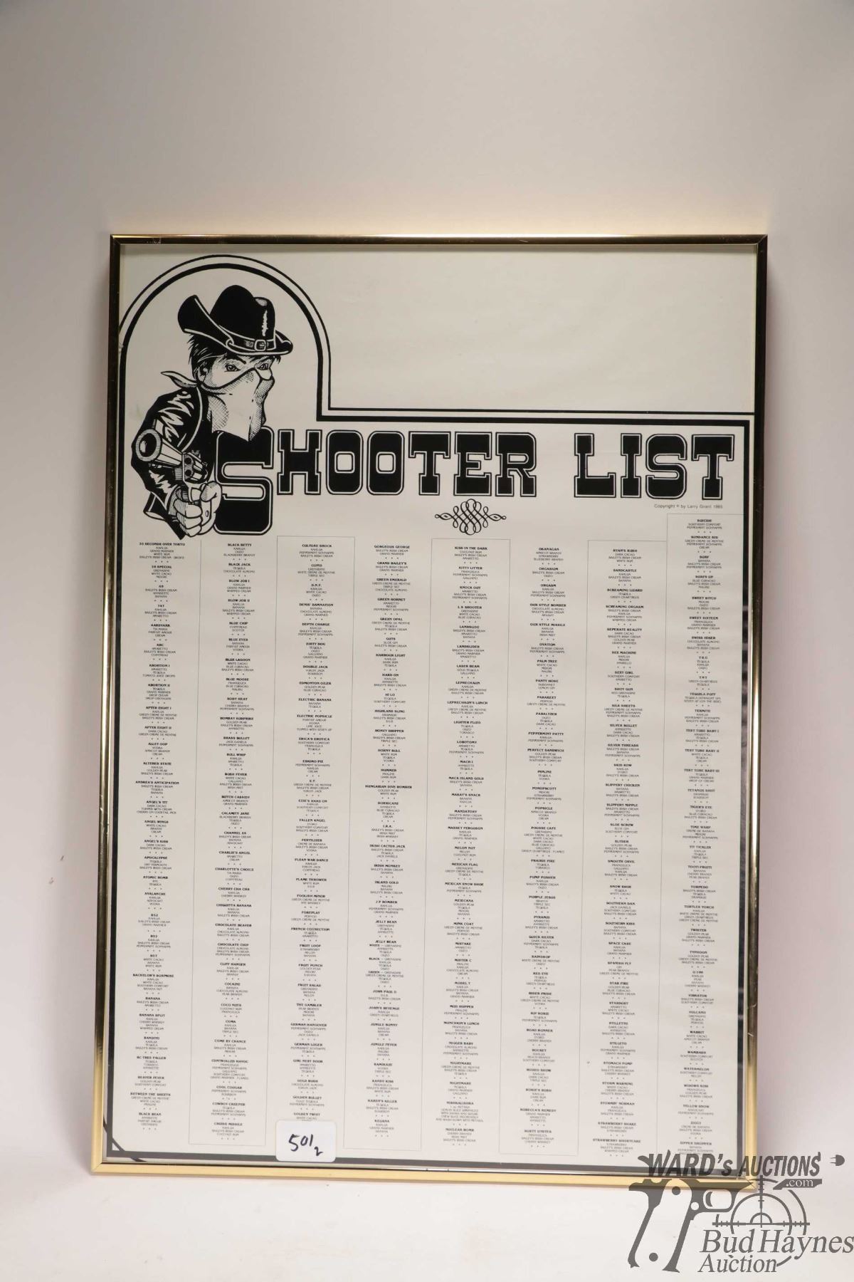 Shot shell theme decanter and drinking glasses included 7 tall and 7 short plus a framed "Shooter List" poster by Larry Grant, dated 1985