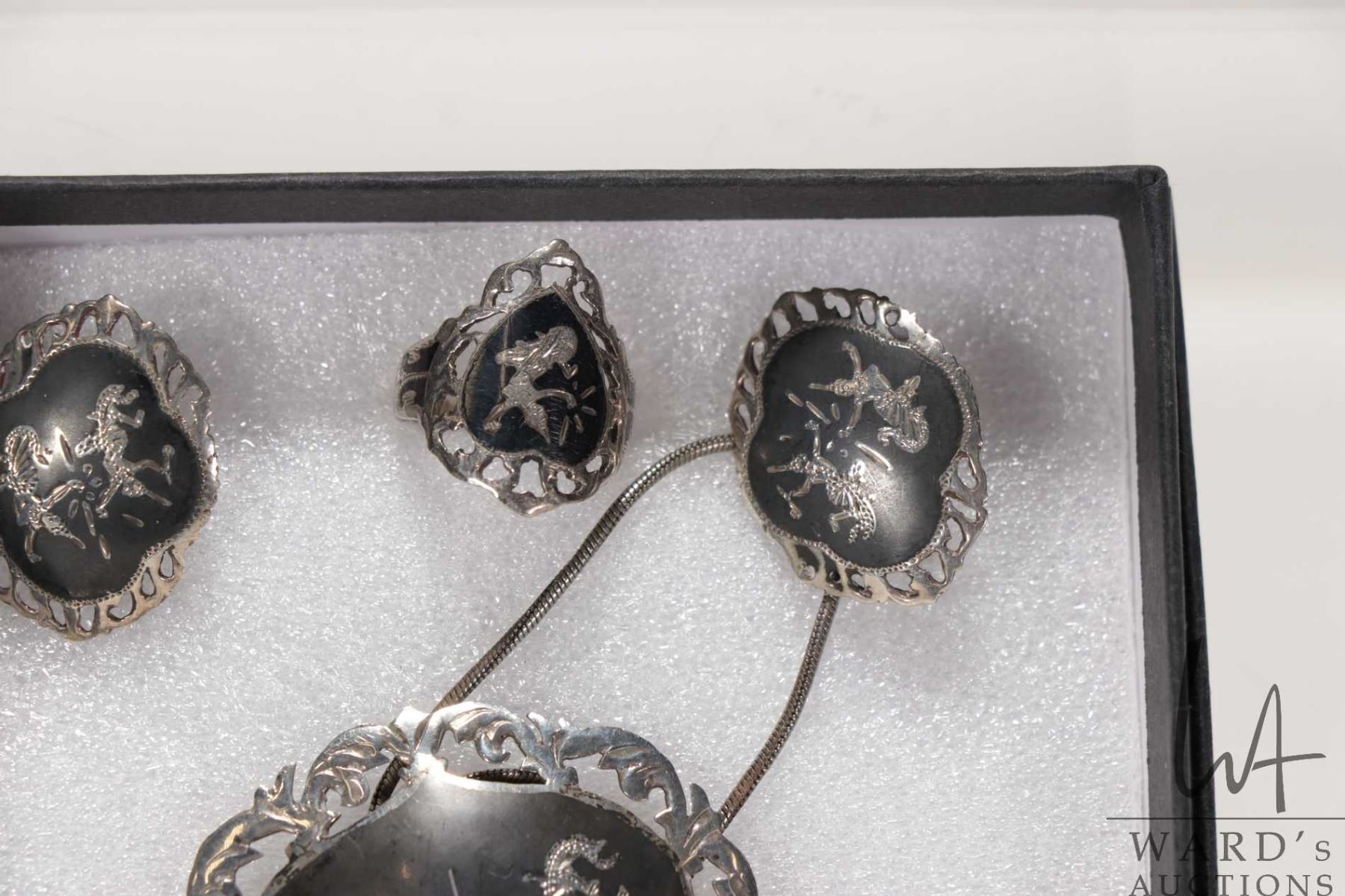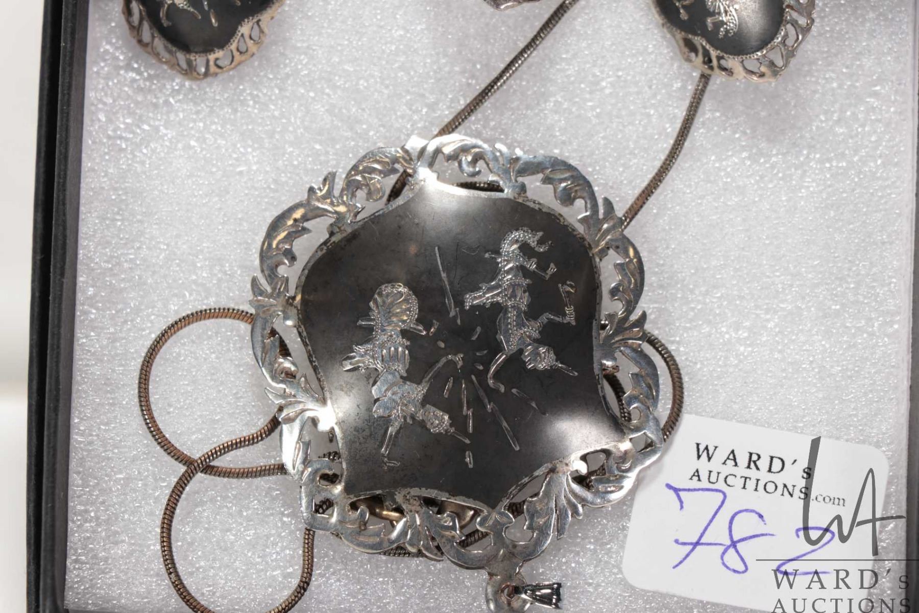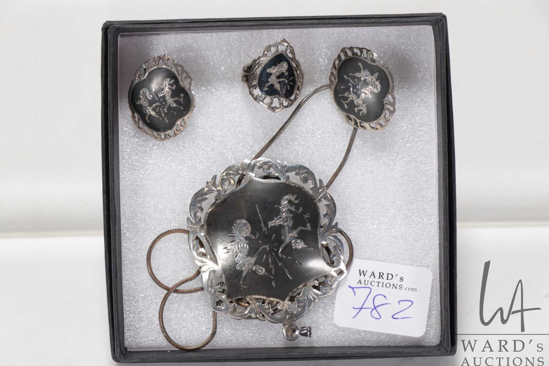 Siamese sterling silver brooch/ pendant with a pair of matching earrings and a ring sized 4.25