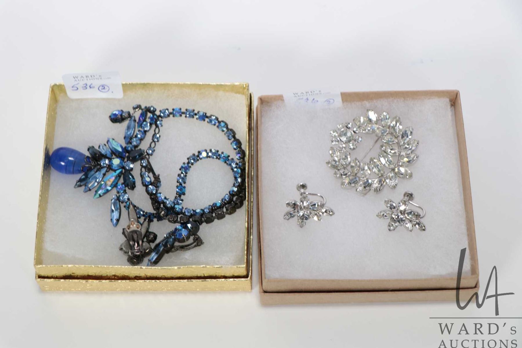 Signed Sherman colourless diamante brooch and signed Sherman earrings plus a signed Sherman iridescent and royal blue rhinestone necklace with Japaned back and a set of coordinating earrings