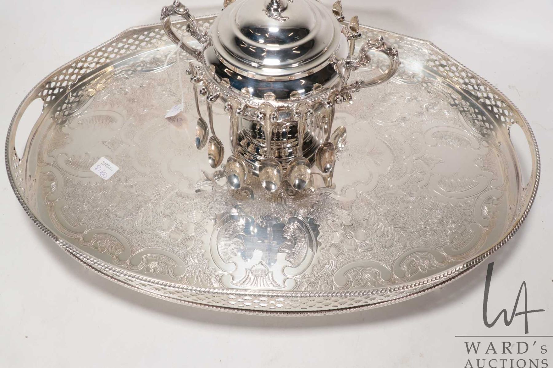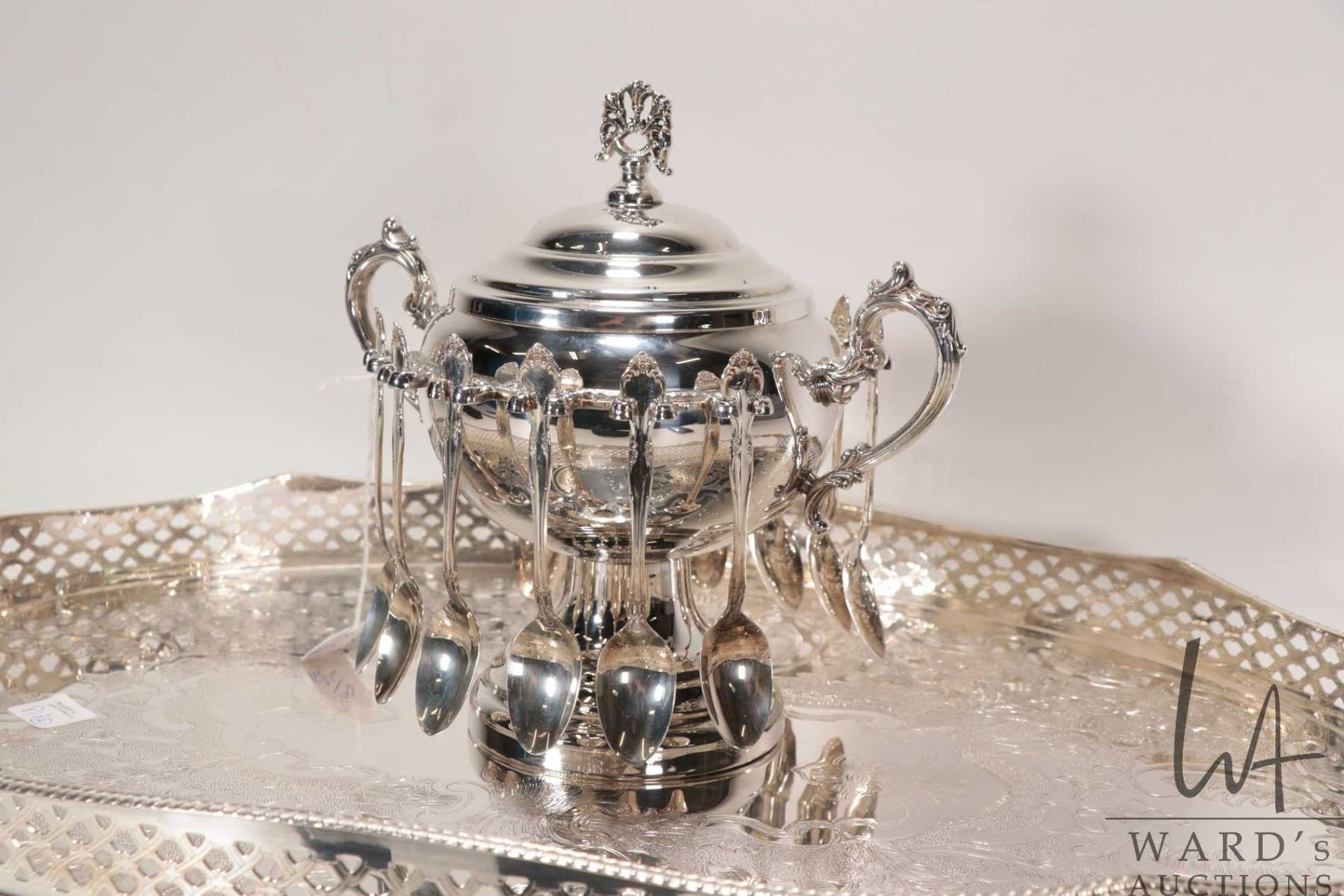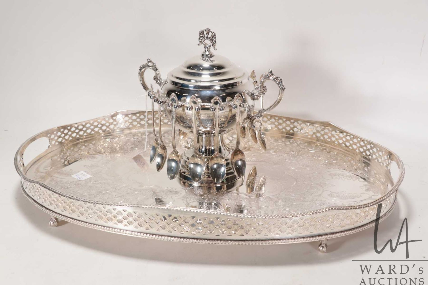Silver plate lidded sugar bowl with twelve teaspoons and a silver plate oval serving tray with scroll engraving and decorative galley 20" in length