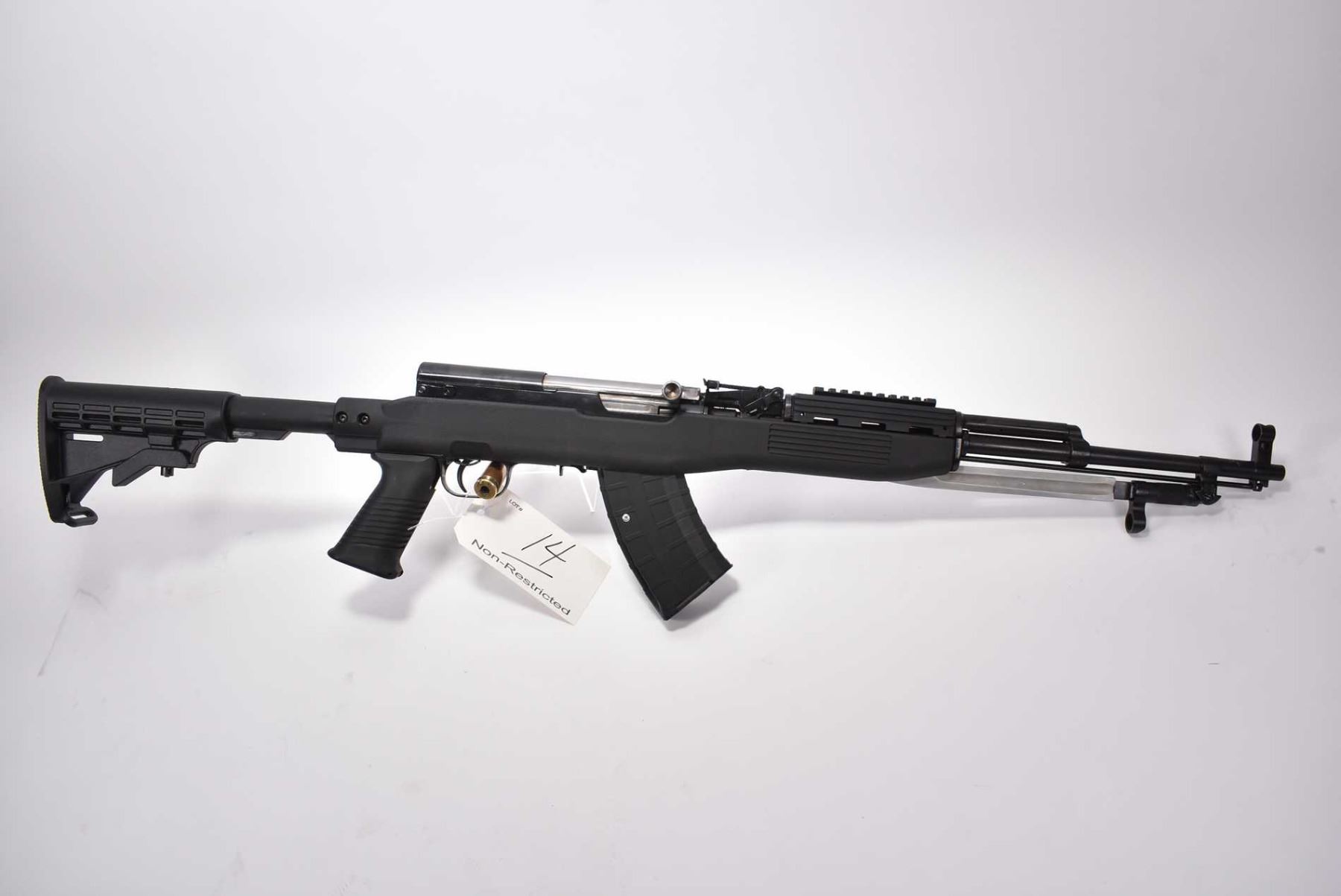 Simonov Model SKS 7.62 x 39 Cal Mag Fed Semi Auto Military Style Rifle w/ 20" bbl [ blued finish, barrel sights, Tapco composite pistol grip stock, and forend, w/ adjustable butt stock, forend rail, folding bayonet, c/w cleaning rod, pinned mag, few marks mostly to metal ] Ser # 2069