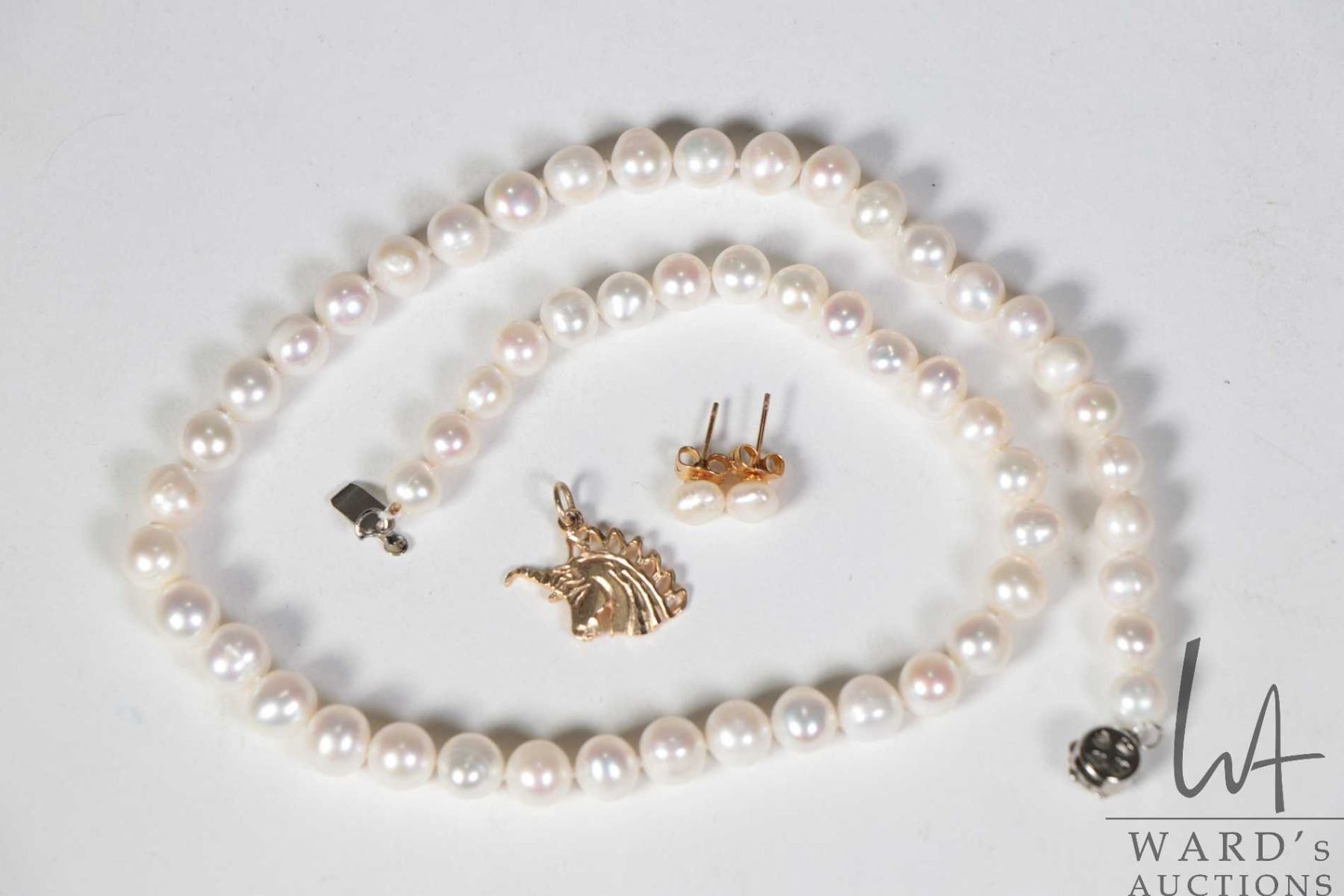 Single strand hand knotted pearl necklace 16" in length plus a pair of freshwater pearl studs and a 10kt yellow gold unicorn charm / pendant