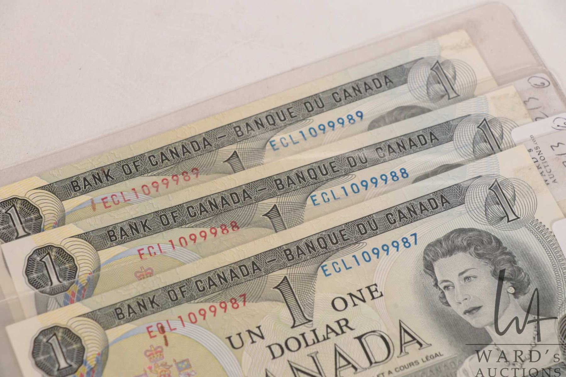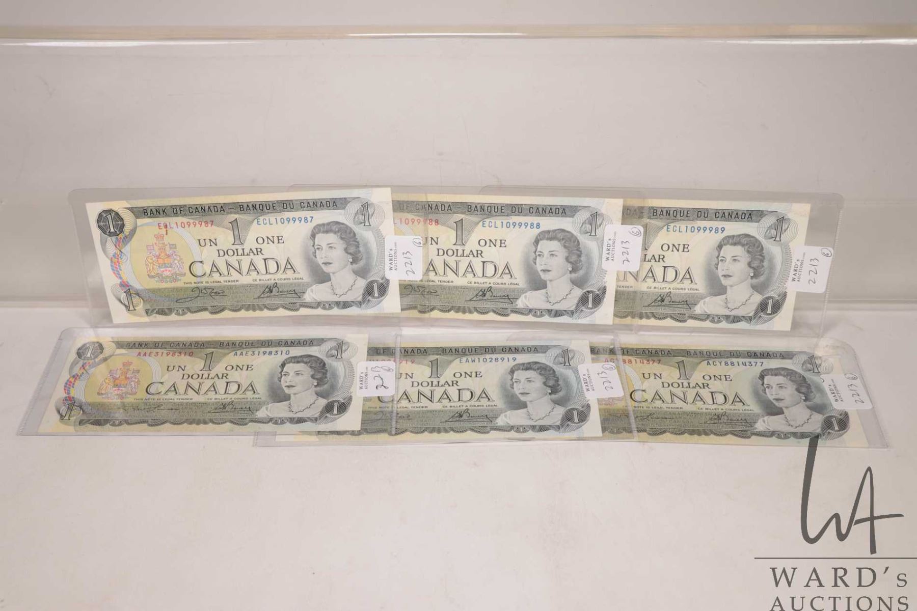 Six 1973 Canadian $1 bills including three with consecutive serial numbers