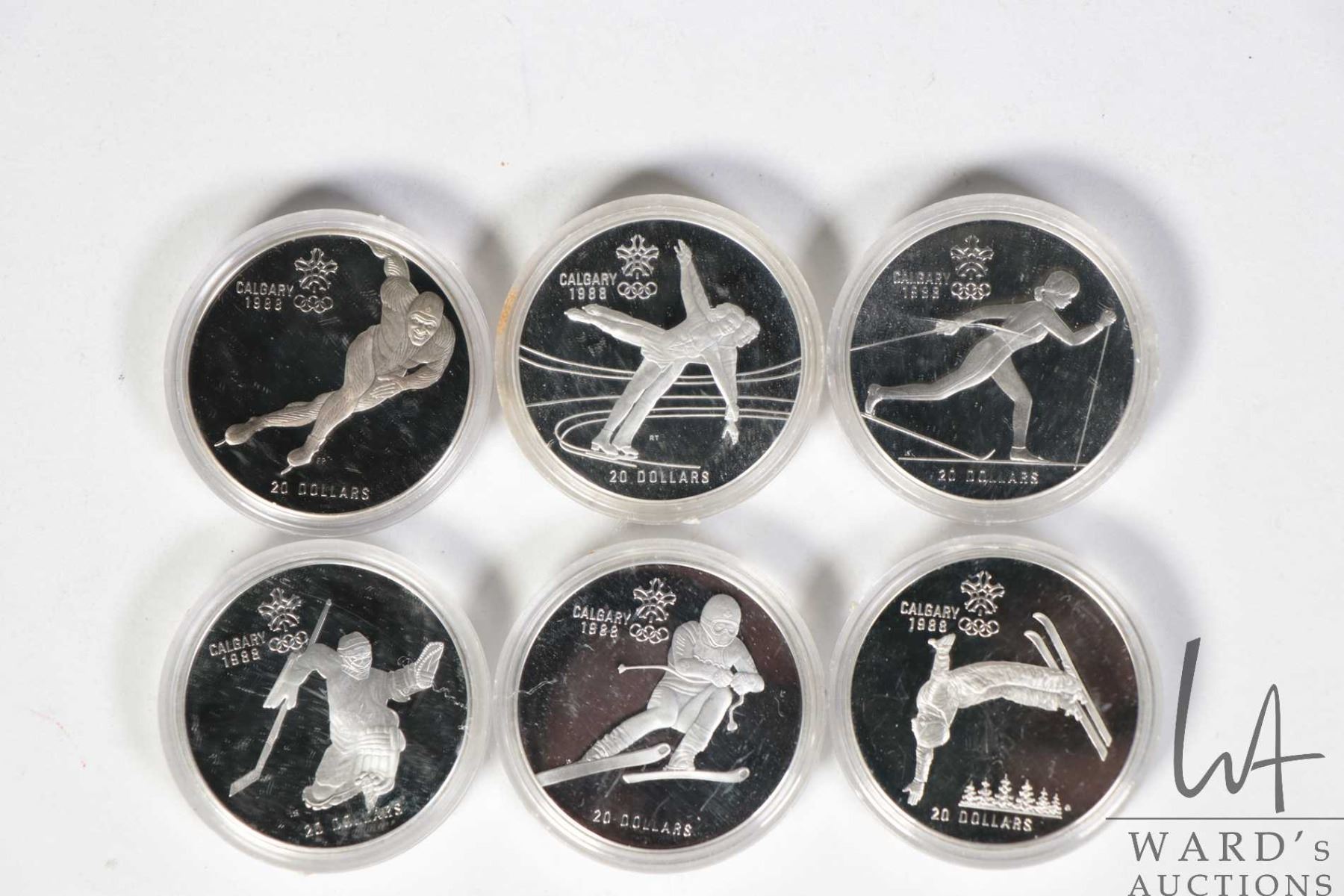 Six 1988 Calgary Olympic twenty dollar .925 silver coins, each depicting a different sport, appear to be uncirculated and in original plastic containers