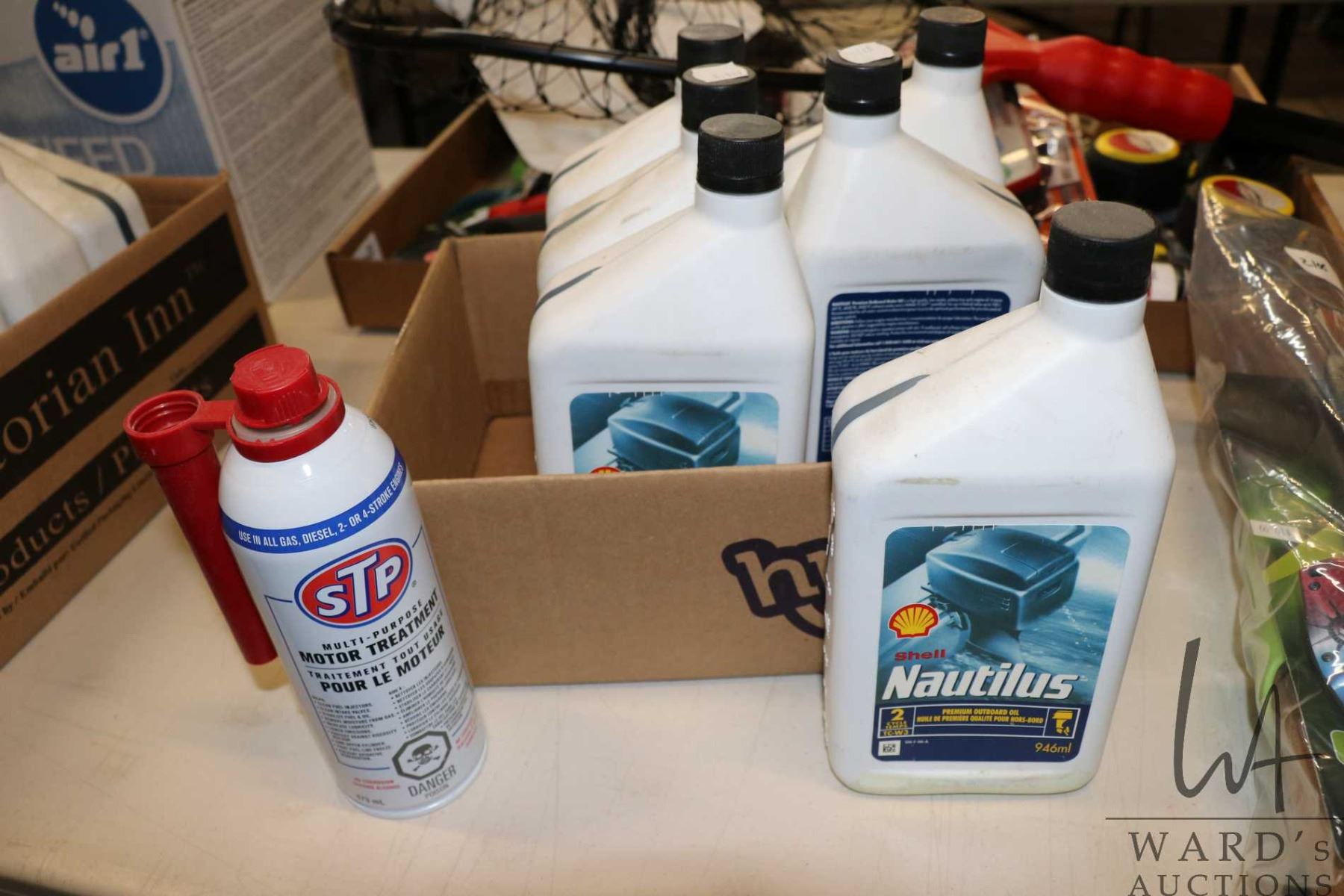 Six 946 ml containers of Shell Nautilus two cycle oil and a 473ml containers of STP motor oil treatment
