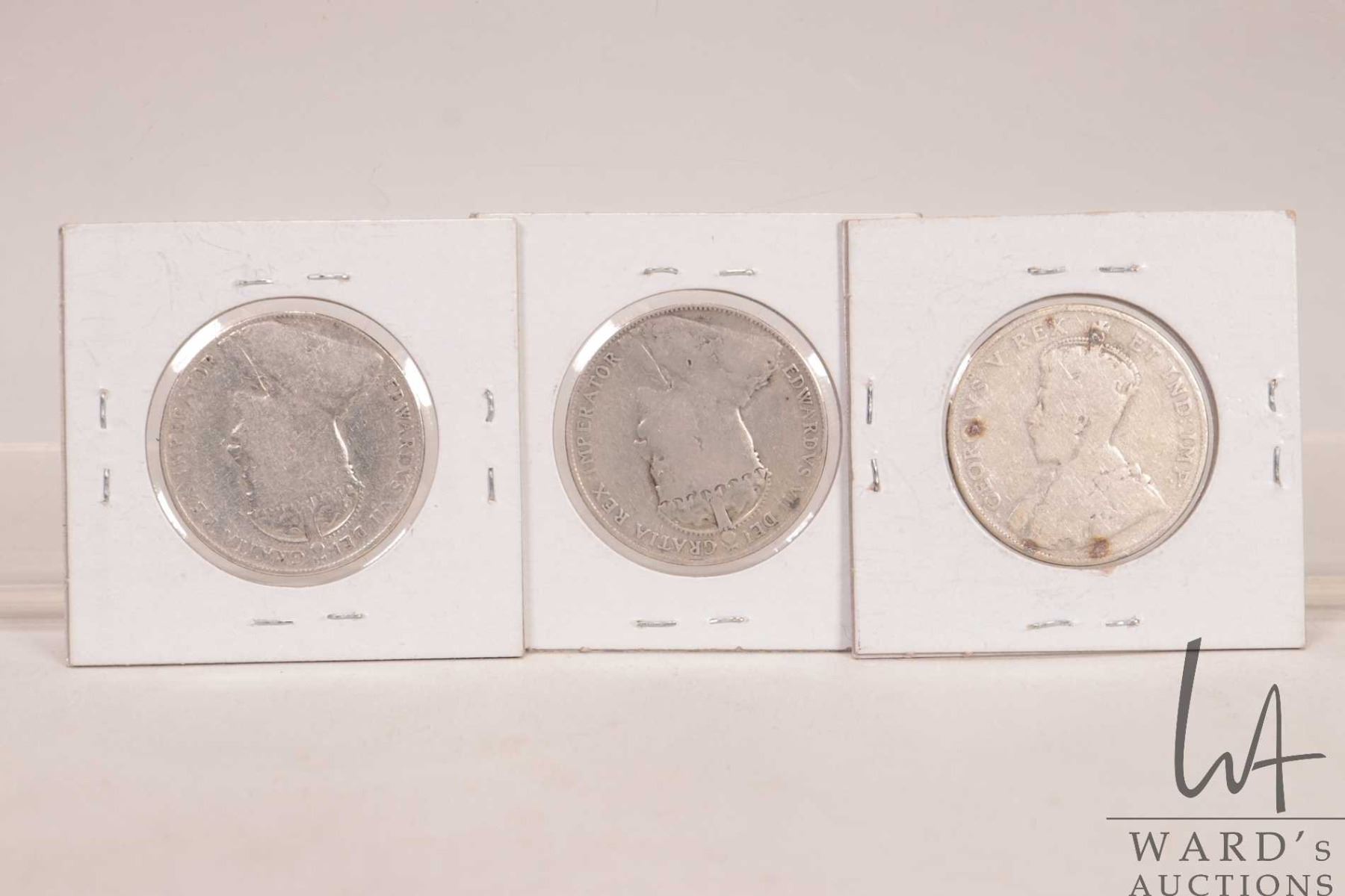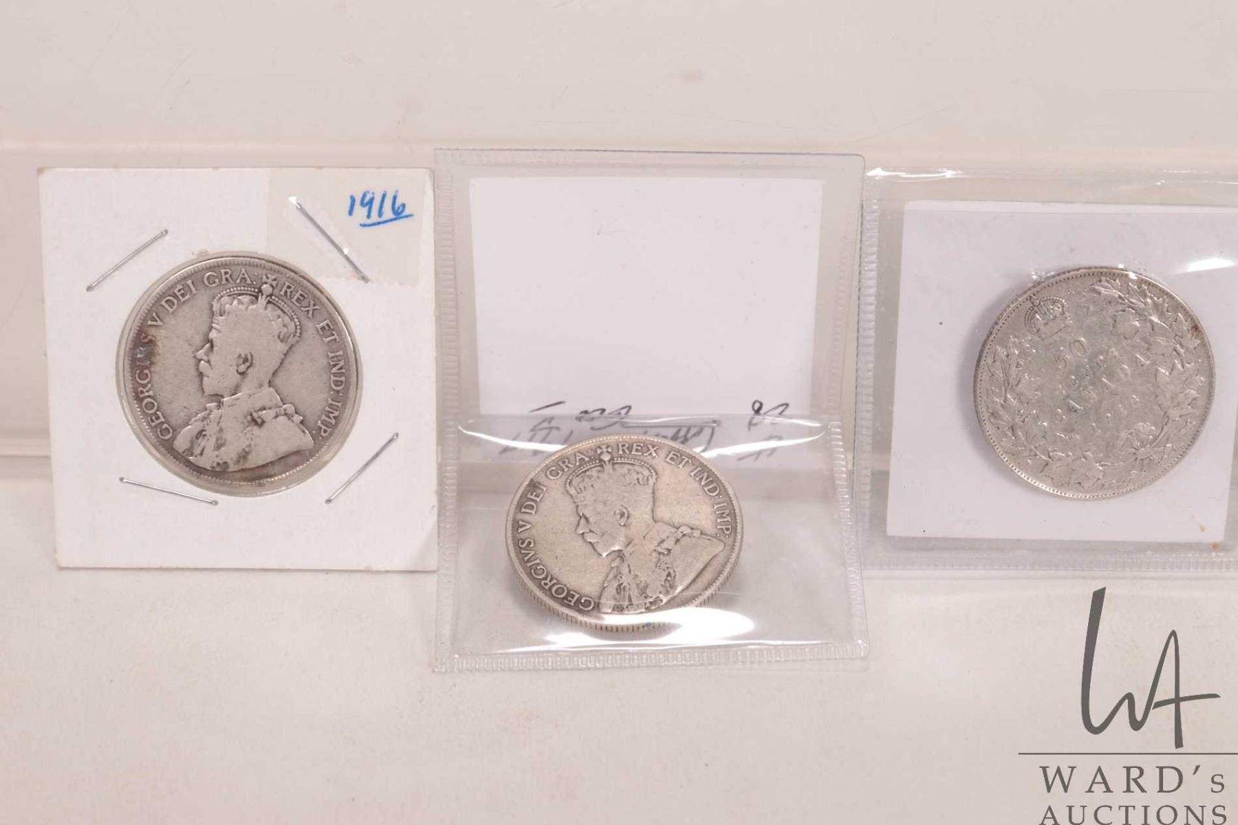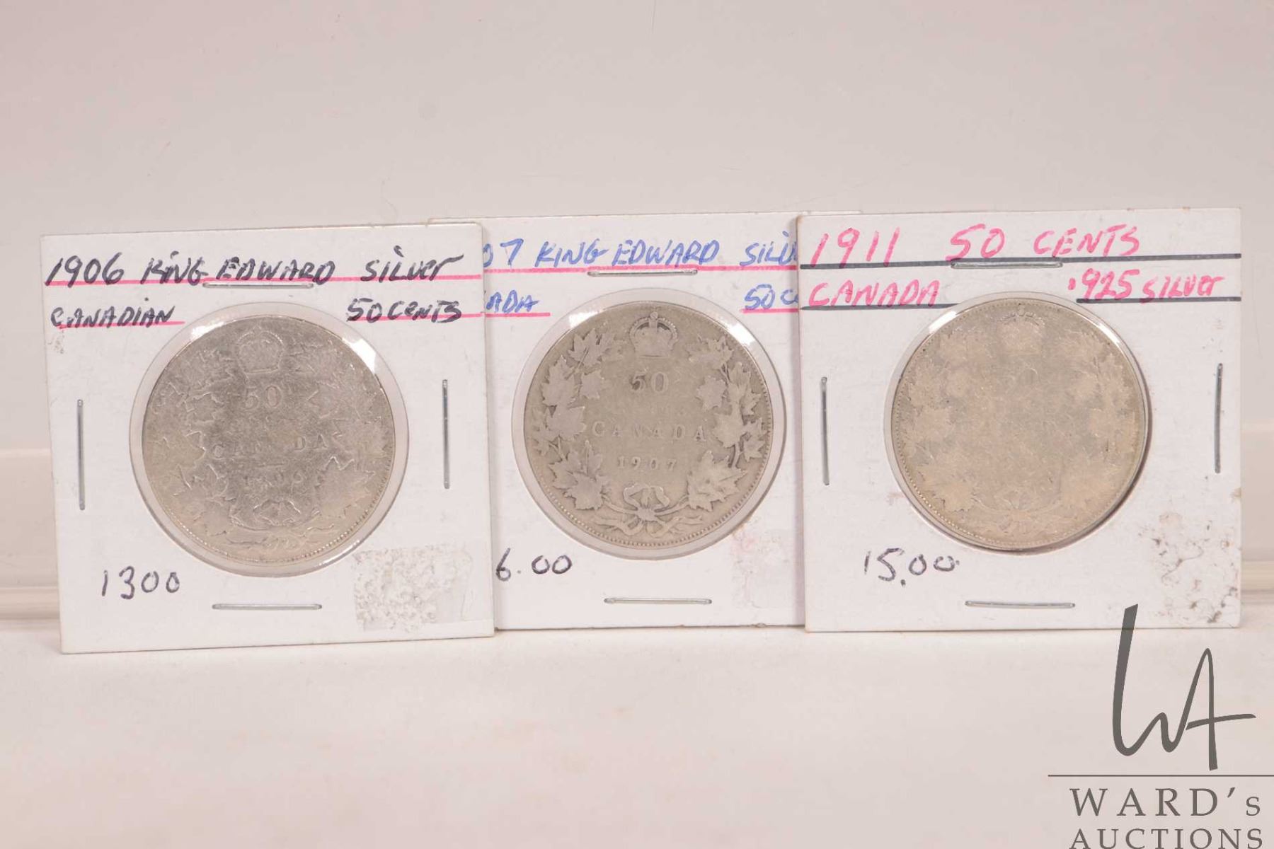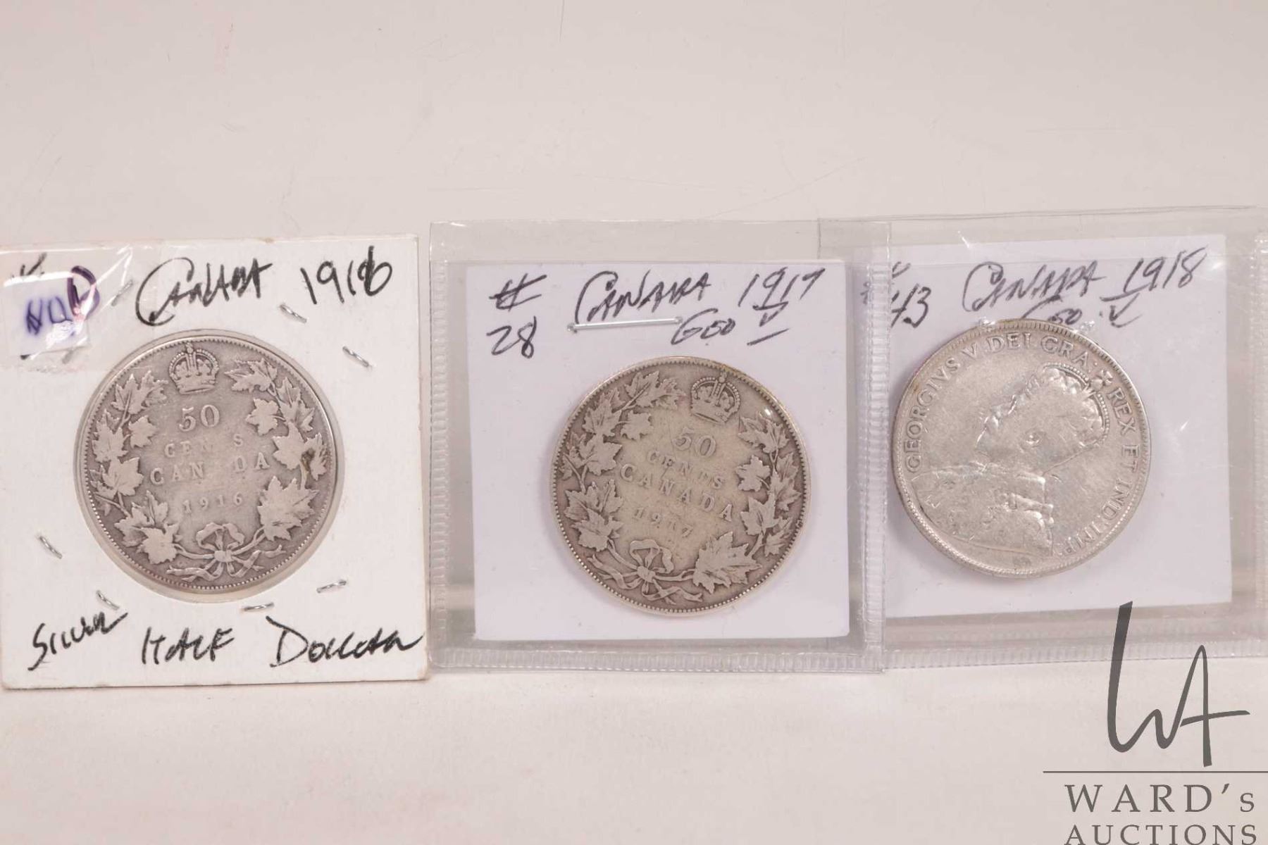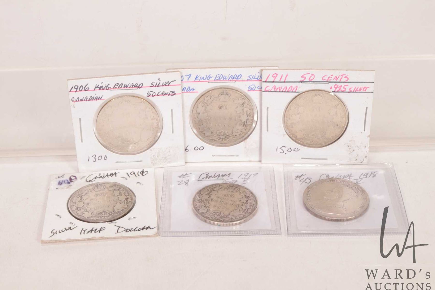 Six Canadian fifty cent coins including 1906, 1907, 1911, 1916, 1917 and 1918