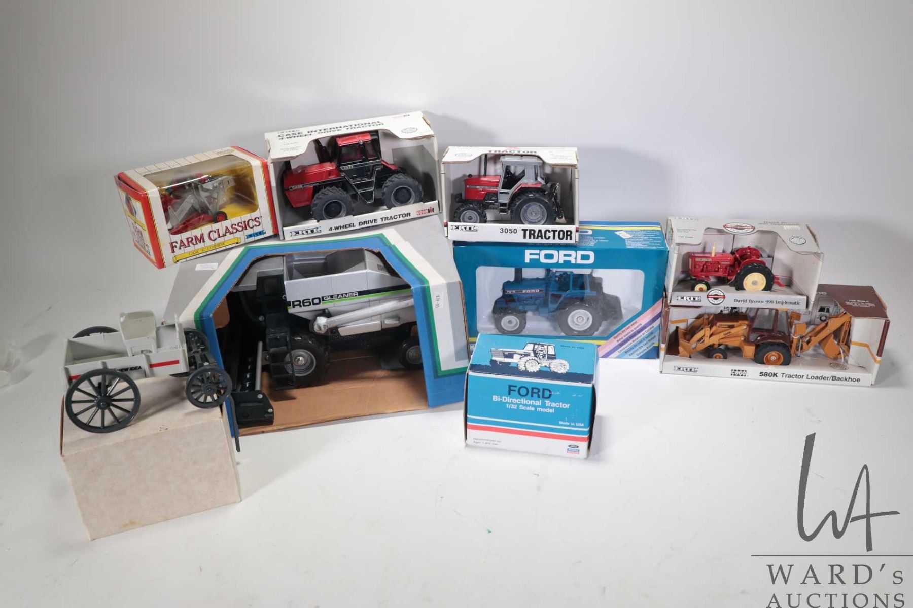 Six Ertl 1/32 scale toys including Case International 4WD tractor, Massey-Ferguson 3050 tractor, Case 580k loader backhoe, David Brown 990 Implematic, Ford bi-directional tractor and Ford TW-5 tractor. Plus 1/43 scale Ertl Case G combine, 1/24 scale Gleaner combine and metal horse buggy. All appear new in packaging