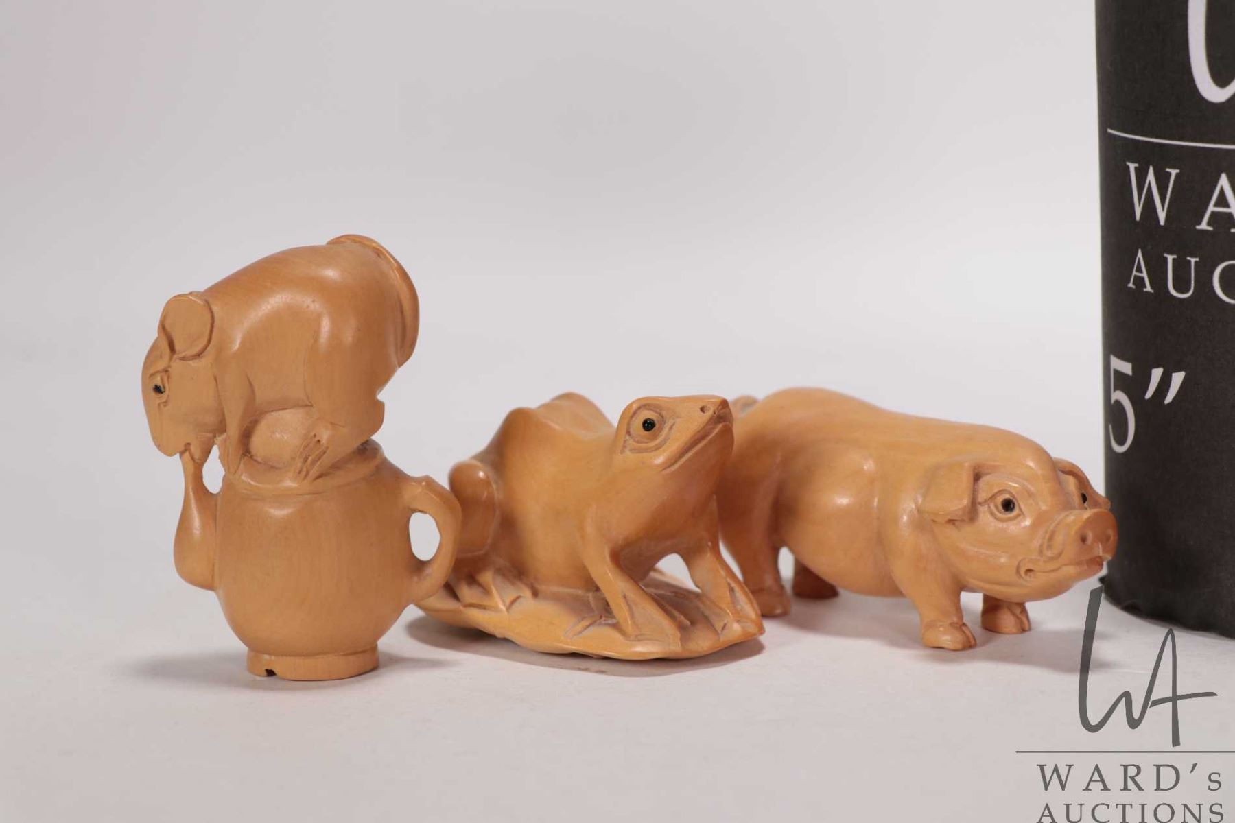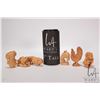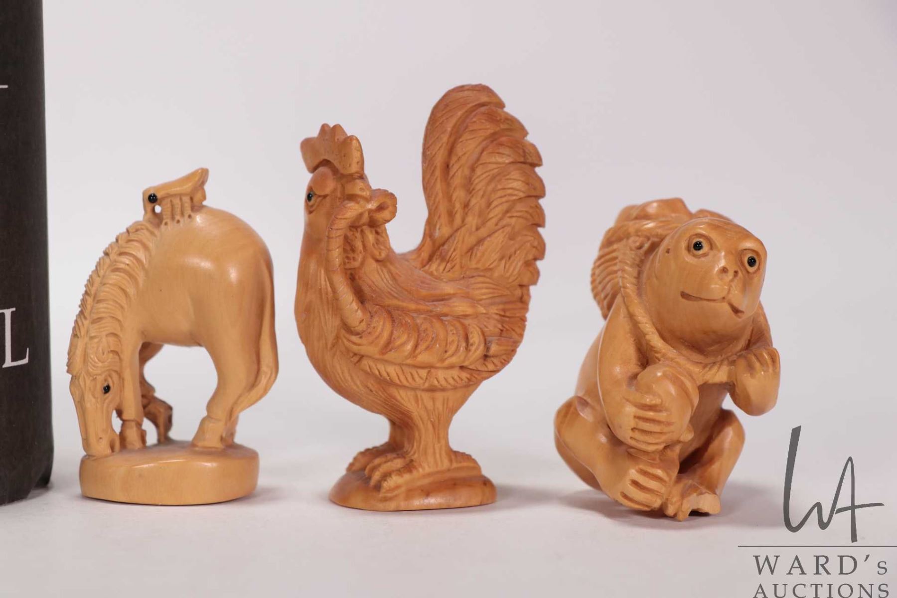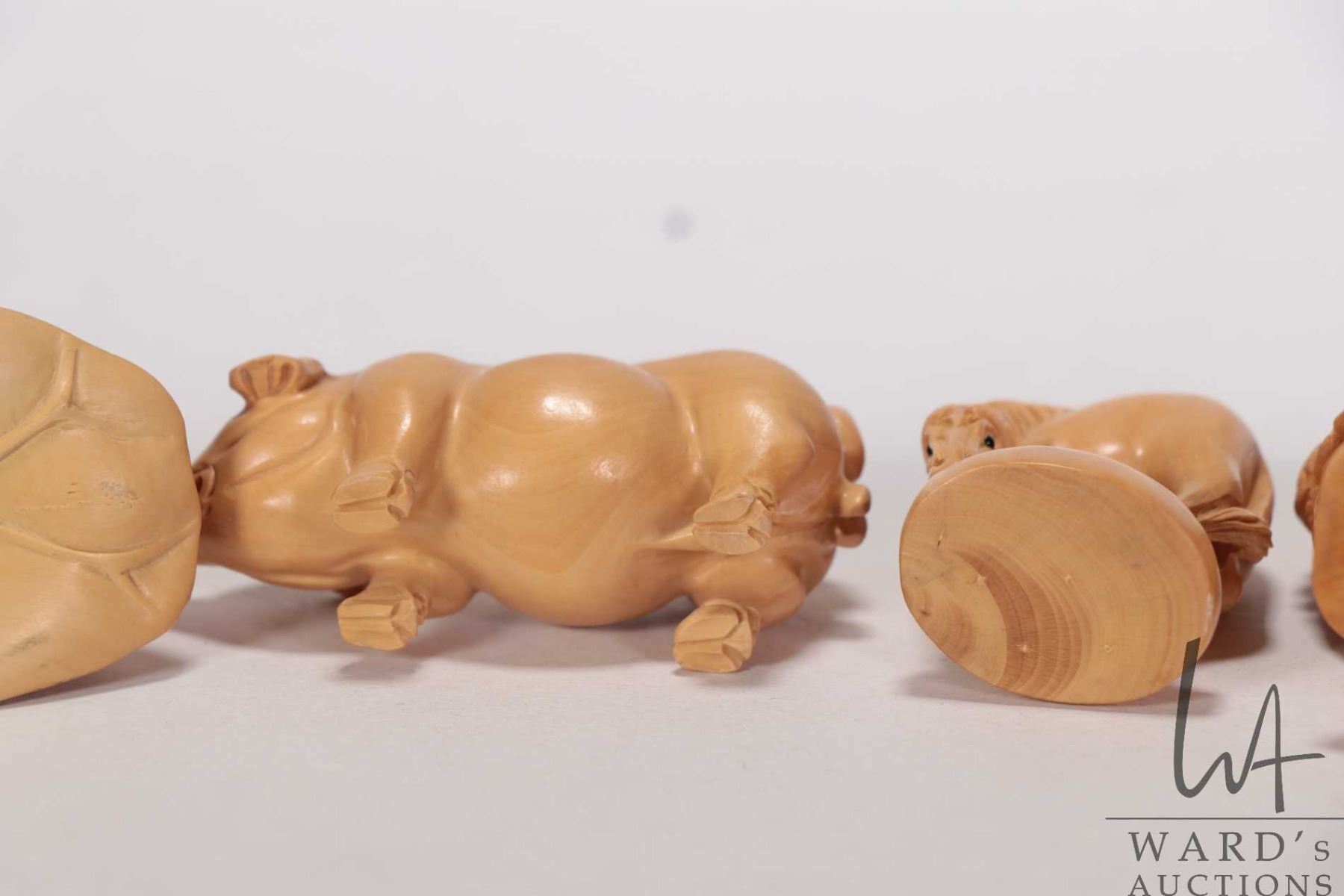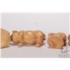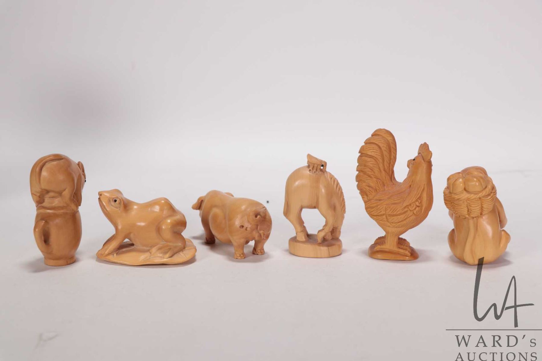 Six Japanese hand carved box wood miniature animals including frog, horse, monkey, rat, cockral and pig, ranging from 1 1/2" to 2 1/2" in height