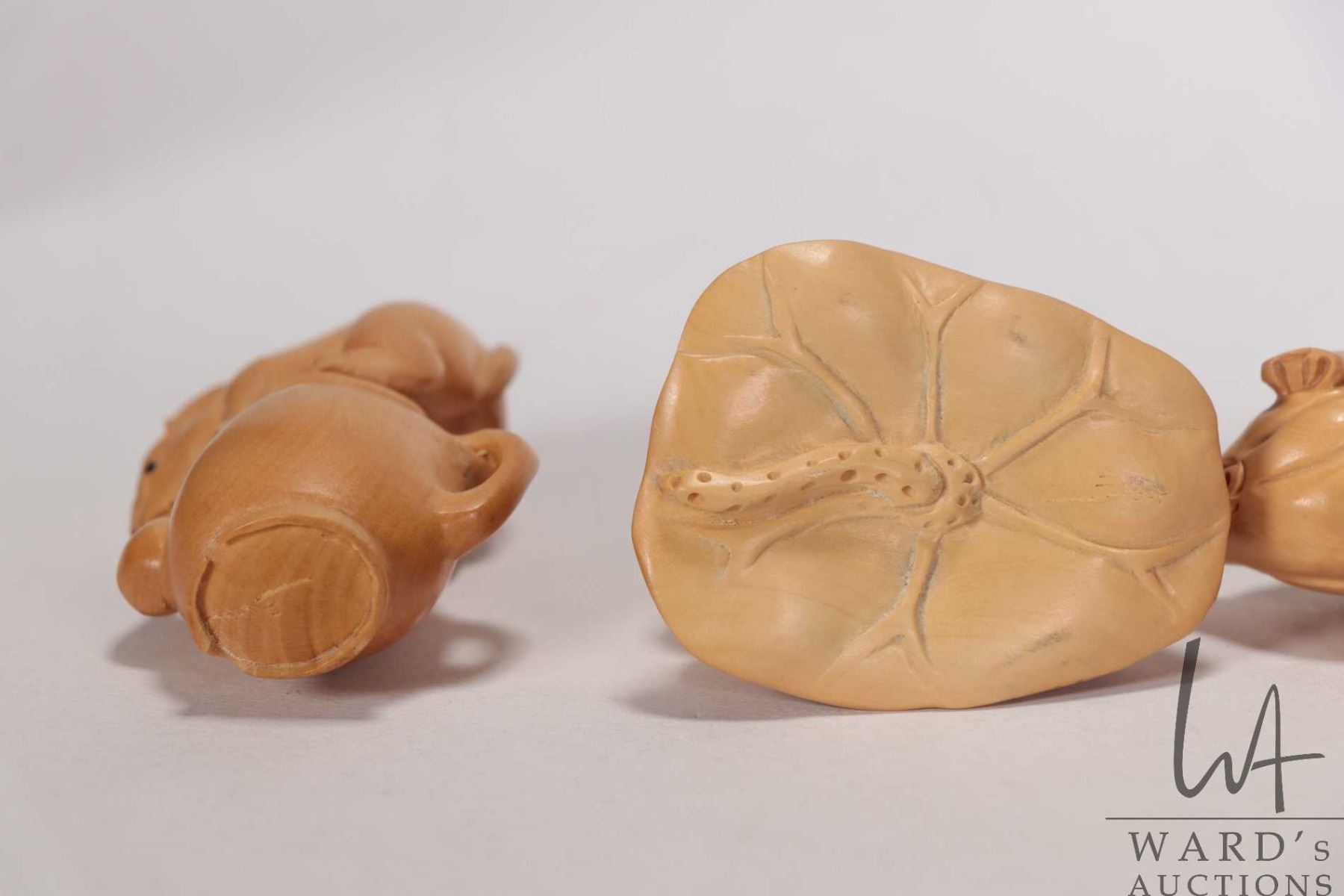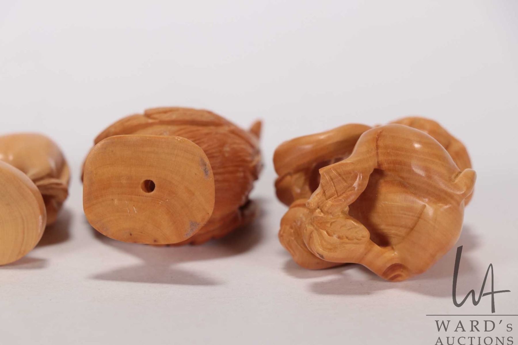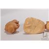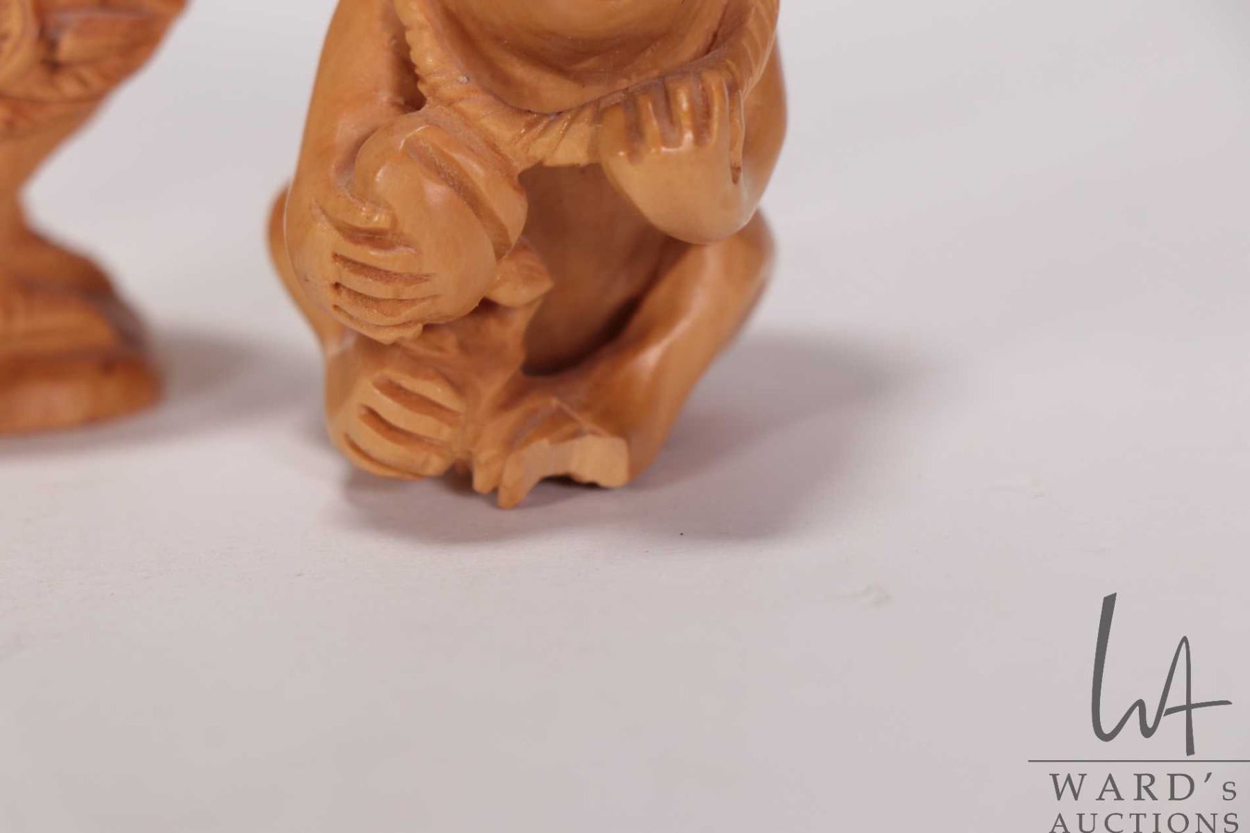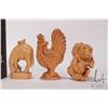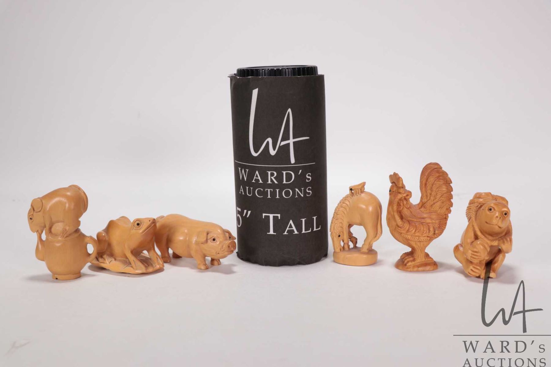 Six Japanese hand carved box wood miniature animals including frog, horse, monkey, rat, cockral and pig, ranging from 1 1/2" to 2 1/2" in height