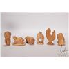 Six Japanese hand carved box wood miniature animals including frog, horse, monkey, rat, cockral and