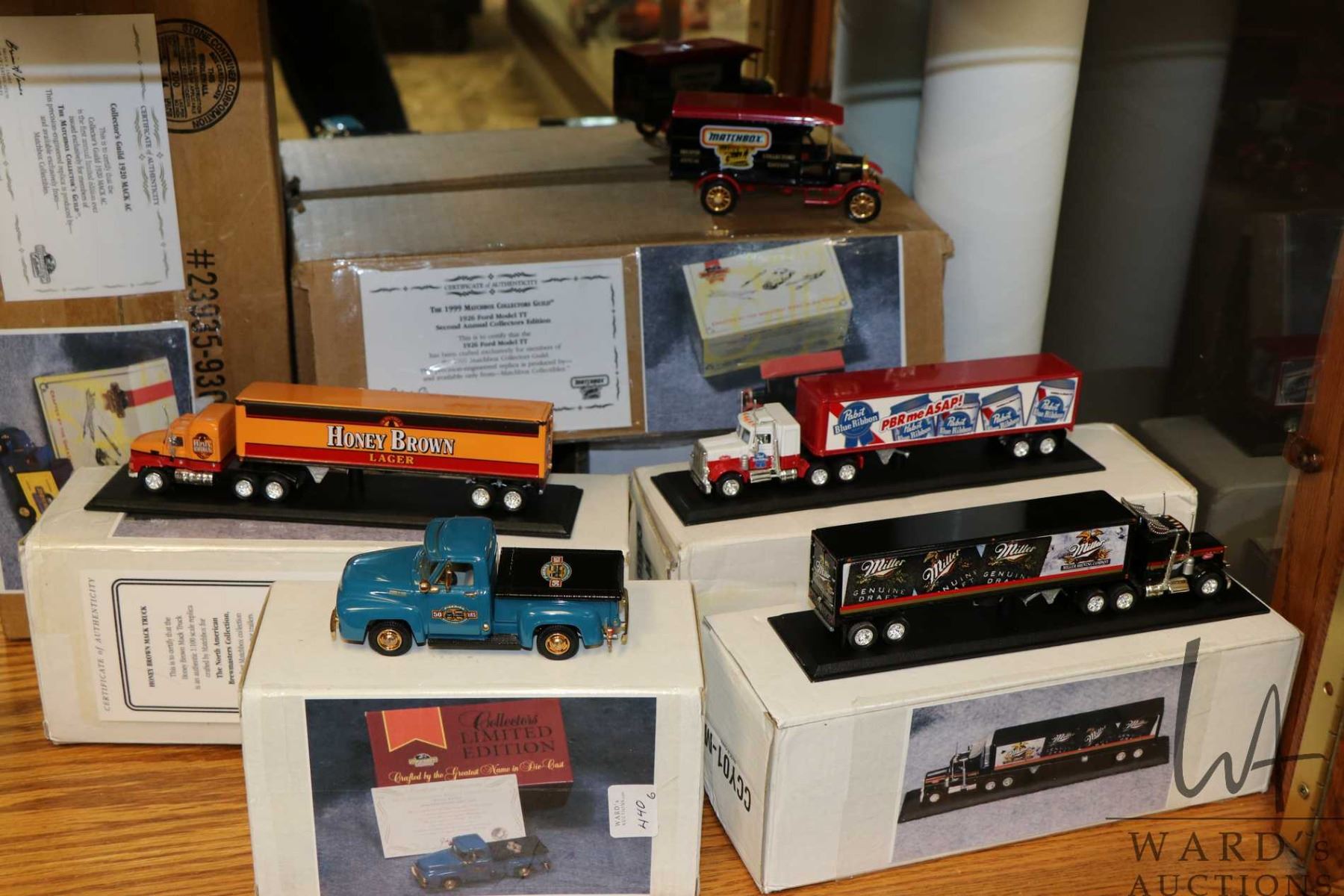 Six Matchbox Collector Edition die- cast trucks including 1:100 scale Miller Genuine Draft Peterbuilt, a Pabst Blue Ribbon Peterbuilt and a Honey Brown Mac Truck plus 1:48scale including 1926 Ford Model TT, 1920 Mac AC, a 1948 Ford F150