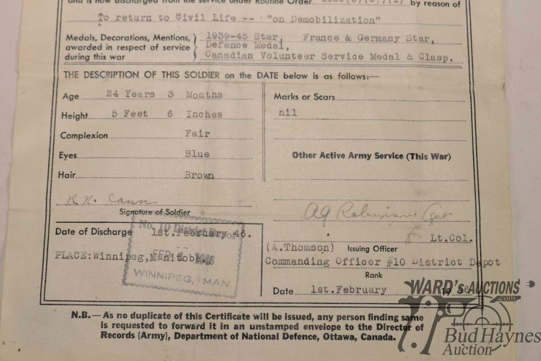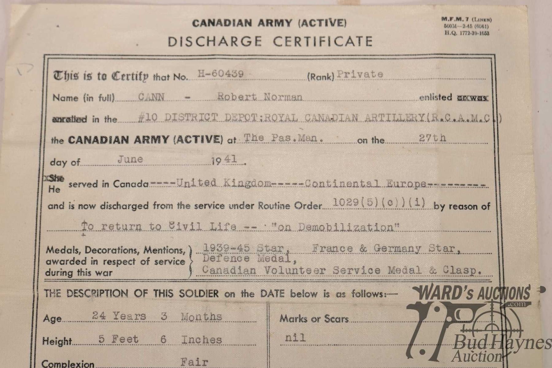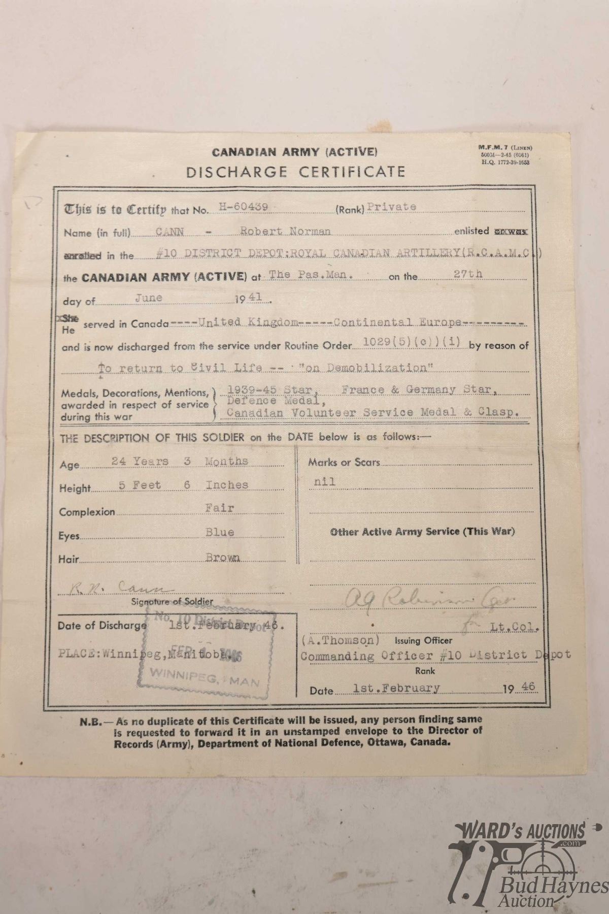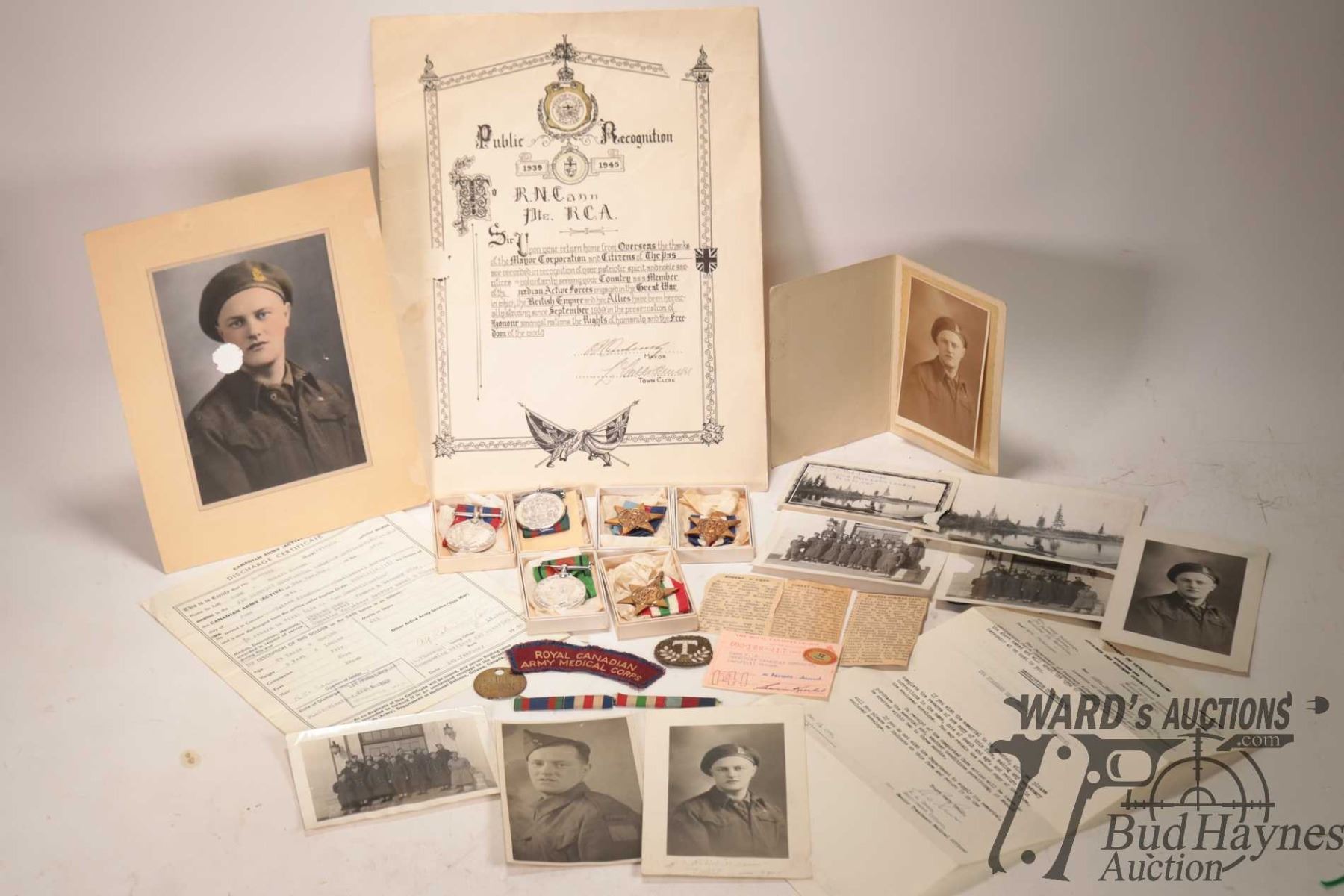 Six WWII replacement medals including 1939-1945 war medal, Canadian Volunteer Service medal. The Defence medal, 1939-45 Star, France and Germany Star and an Italian Star plus documents and photos related to Private Robert Norman Cann